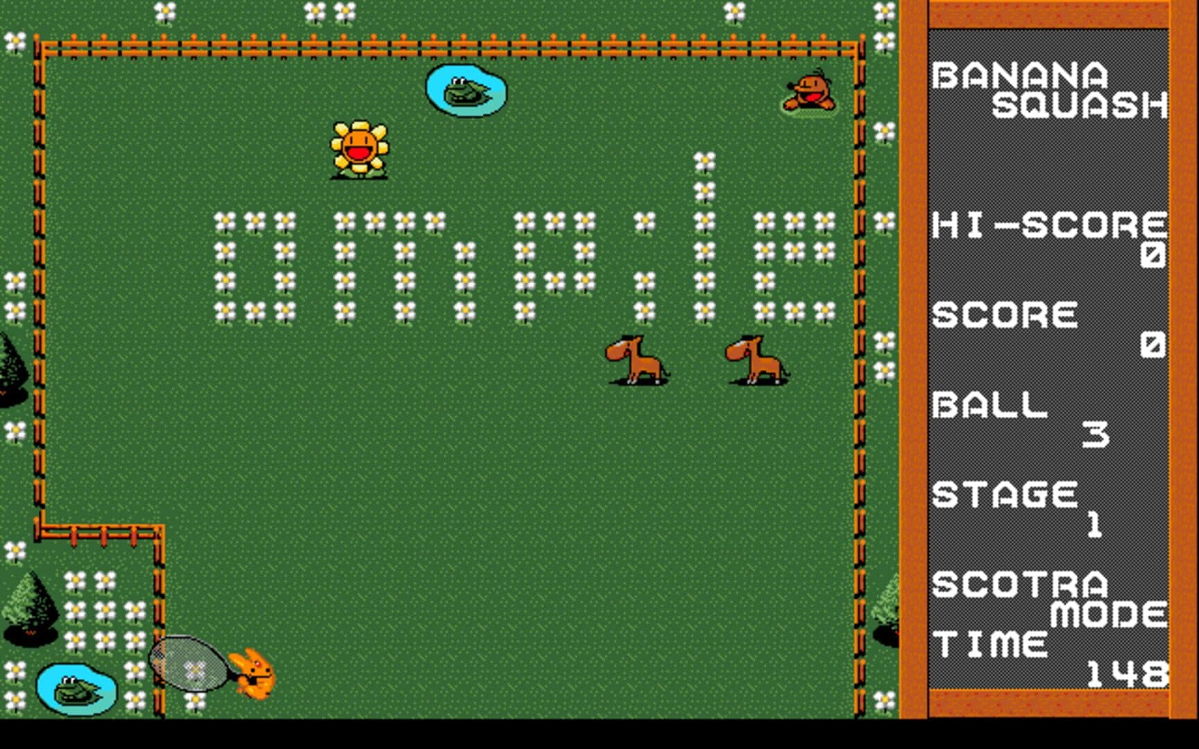 In Banana Squash the player takes control of Carbuncle. Wielding a squash racket, Carbuncle must hit a ball into blocks waiting overhead.
