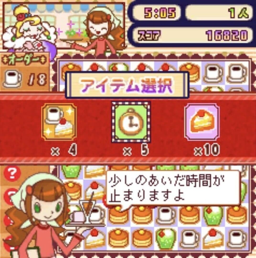 Players take control of the head bartender of the Kururin Cafe, a popular all-day spot. This puzzle game follows match-three rules using a rotation mechanic similar to Octomania. Players control a cursor the size of four tiles, and can rotate the position of the four tiles within the cursor's radius. Connecting three or more tiles of the same kind makes them disappear. Customers will write their orders on the board, and players get bonuses for fulfilling customers' specific orders. There are three main game modes: "Kururin Mode" has players fulfilling orders within a set time limit; "Challenge Mode", a score competition with an online learderboard in which players complete as many combos as possible in two minutes; and "Tokorin Mode", an endless mode in which players play without a time limit.