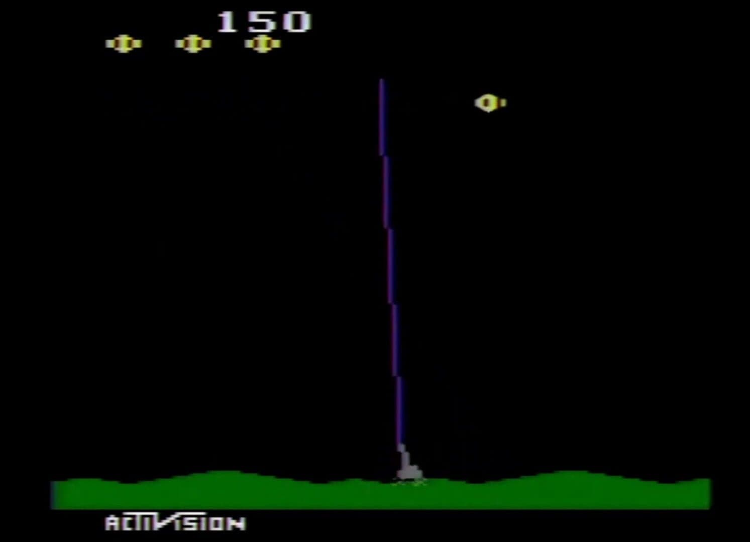 The object of Laser Blast is to destroy a series of land-based enemies. The player controls a fleet of flying saucers, operating one at a time. On the planet surface below are a group of three mobile laser bases, guarded by an invisible force field that prevents the player's saucer from getting too close to the surface. Both the player and the enemy bases are armed with laser blasters, which may fire a single continuous beam at a time. If the player's saucer is hit, it will lose altitude and crash to the ground; however, the player may direct this fall, potentially into one of the bases, destroying it as well. Each succeeding wave of enemy bases moves faster and targets the player's saucers more quickly, while the force field becomes stronger and decreases the amount of space in which the saucer can move. Players score points for each base destroyed, with points multiplying each wave up to a maximum of 90 points per base. Players earn extra flying saucers with each 1000 points scored and may keep a maximum of six extra saucers in reserve. When the score of 999,999 is reached, the digits in the score turn to exclamation points, and the game ends.