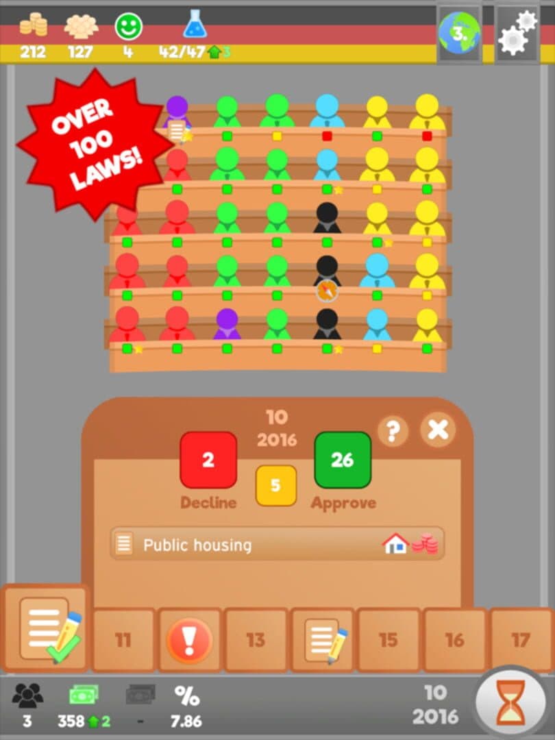Lawgivers is a turn-based political simulation game. Run for elections with your own party and enter parliament to approve or abolish laws. Appoint the president and decide whether you want a democracy or just a fake one instead.