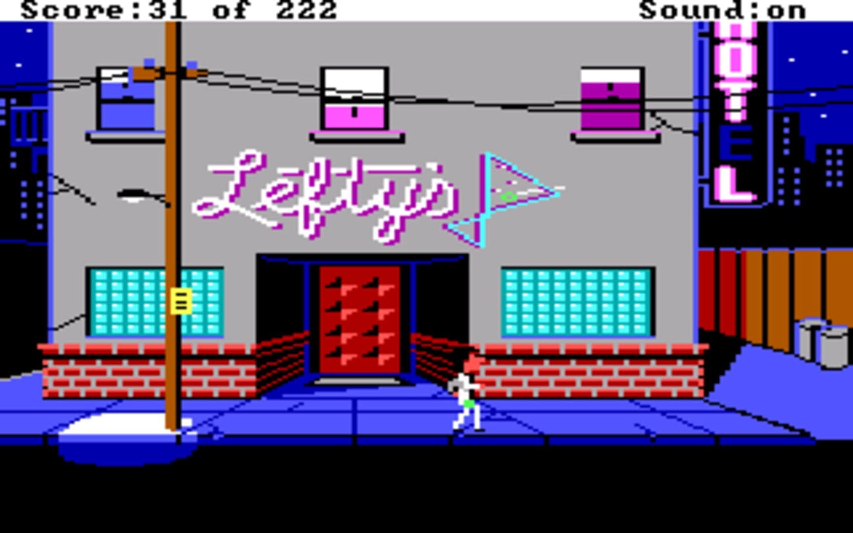 A middle-aged male virgin named Larry Laffer desperately tries to "get lucky" in the fictional American city of Lost Wages. Your goal in Leisure Suit Larry in the Land of the Lounge Lizards is to find and seduce the girl of your dreams. This goal won't come easy, because you only have one night, and unfortunately, you are stuck with Larry's looks. Other problems, such as lack of money, lack of opportunity, and bad breath can complicate things significantly. Your interaction with the game controls the outcome of each situation. For example, having your character sign on with a major league baseball team or start a successful men's magazine could be beneficial to your ultimate goal. On the other hand, catching a fatal disease or losing all your cash can only impede your progress. A combination of common sense, logical thinking, and downright sheer luck is needed to achieve your goal.