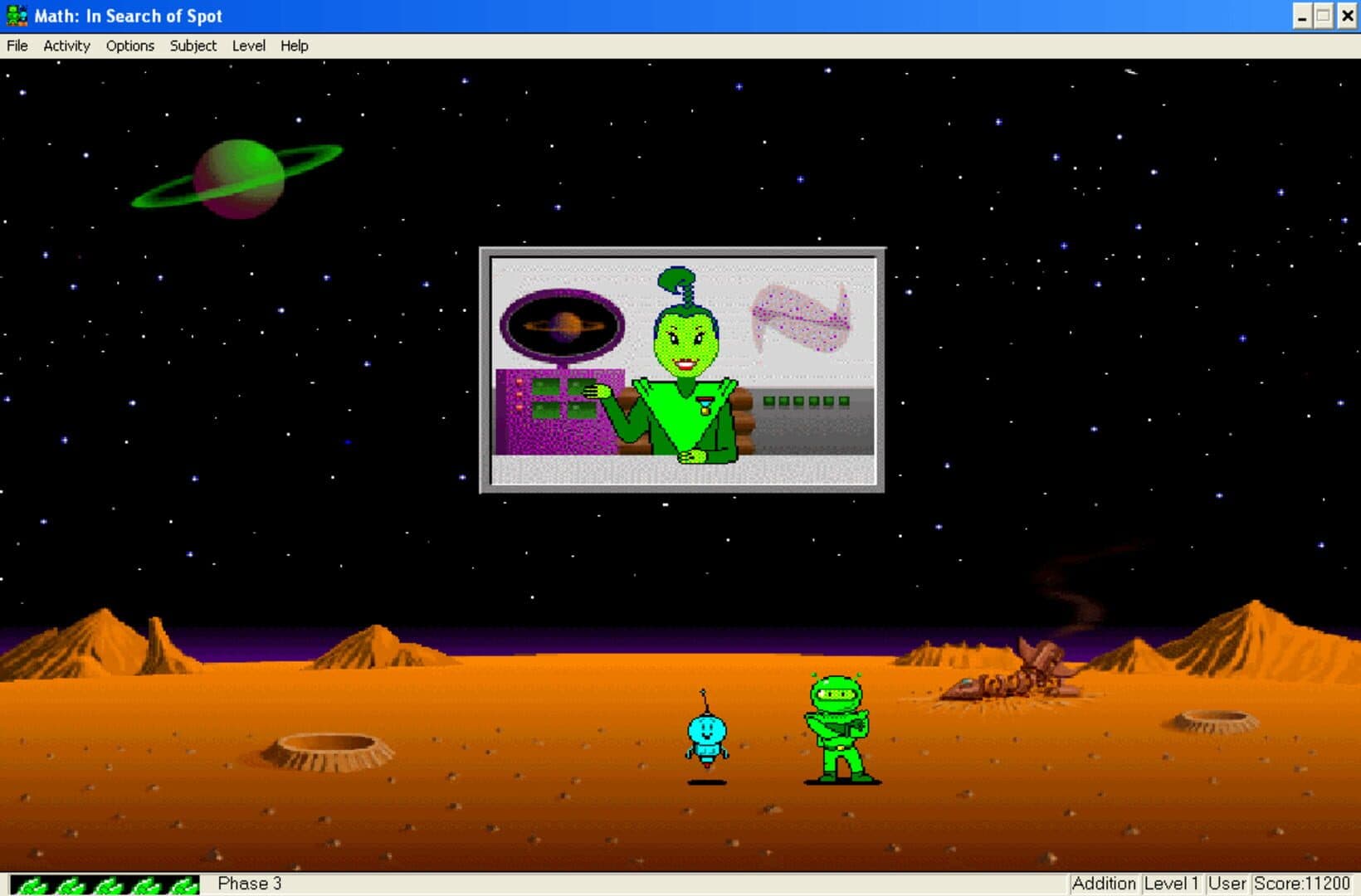 A follow-up to the original Math Blaster! games, Math Blaster: In Search of Spot is an educational title with arcade elements designed to help students learn maths while having fun. The game allows students to practice basic addition, subtraction, multiplication, and division skills in addition to fractions, decimals, percents, estimation, and number patterns. The subjects can be practiced separately or together in review. Six levels of difficulty are provided. Like the previous titles, the game also includes an editor to create new problem sets (present in the PC version only).