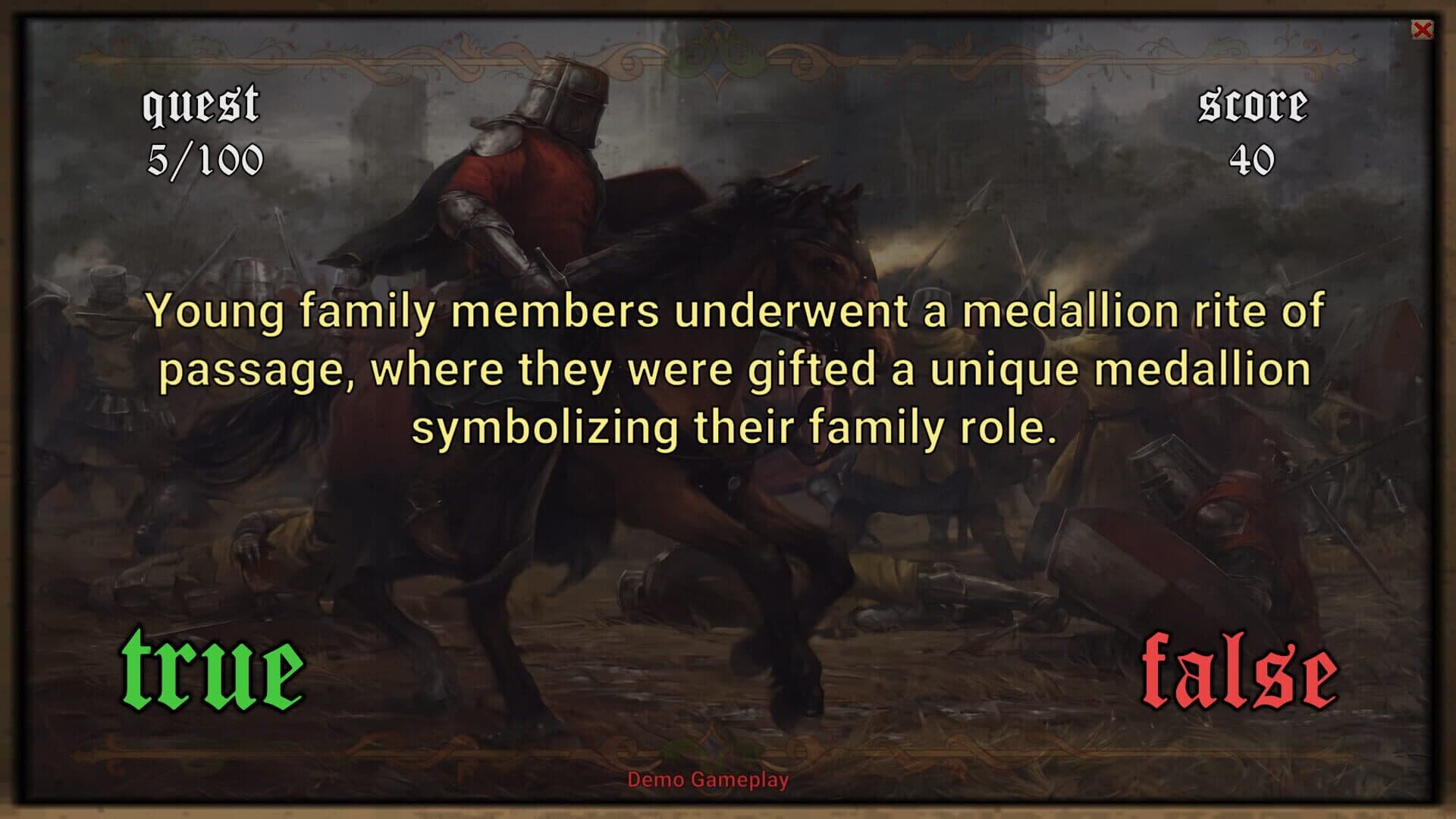 Medieval Questionnaire is an educational game that tests your knowledge of medieval times with true or false questions.
