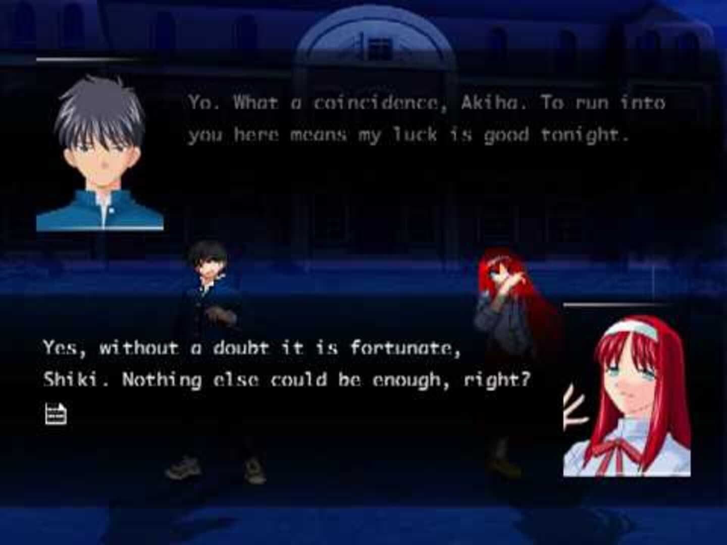 Tohno Shiki hears of a new series of murders in Misaki similar to the ones that took place in Tsukihime. Whilst searching for the murderer he meets Sion Eltnam Atlasia who initiates a fight with him, attempting to capture him. After the fight she reveals that her reason for attempting to capture him is to get in contact with the "True Ancestor" (referring to Arcueid) so that she may acquire information on the "cure for vampirism". Shiki then decides to help her with this task. The sequel to the visual novels Tsukihime and Kagetsu Tohya, Melty Blood is a combination visual novel/fighting game. The story moves through a series of fights. Depending on the outcome of each fight, the story will branch in one of two ways. Ultimately this corresponds to the ending of the game. The first couple of PC releases had adventure style stories with branches and multiple number of endings and a secondary story in arcade mode. Later versions only have the arcade mode, but they have many more characters.