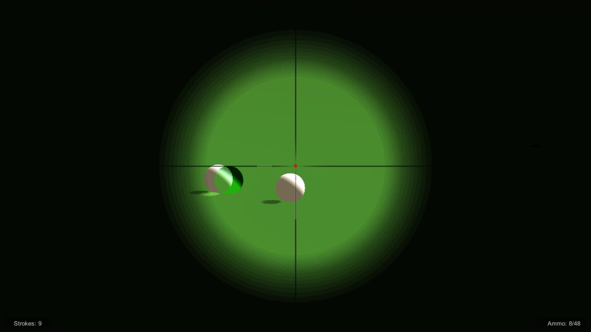 Listen up, soldier! You’re gonna be dropped into hostile territory and the only way you’re gonna survive is with your instincts and an indomitable will to crush your enemies. You’ll be outfitted with high-tech, highly destructive weapons. Then you’ll shoot that god dang golf ball until it’s round, cowardly butt falls right into the course hole. Par? John Wayne didn’t care about par! The .45 Iron, Bolt Action Driver (+scope), and Fully Automatic Golf Gun (FAL Wood) will help you punish that white, dimpled menace all the way to the flag. We’ll even automatically keep track of your stroke count, soldier! Watch out for quaint scenery and environmental hazards, like cute trees minding their own business and rocks that want nothing to do with you.