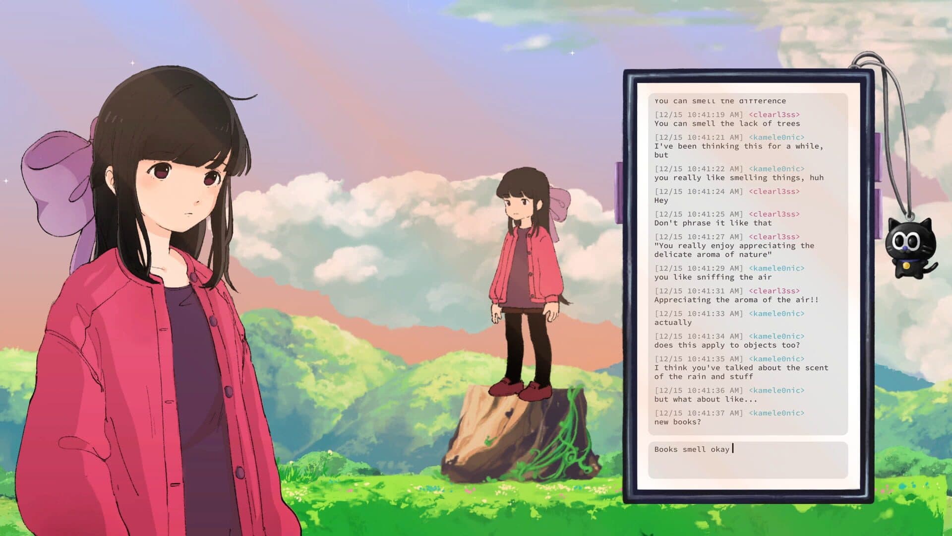 Clara wakes up to a phone that isn't hers. On it, she finds a perplexing message left by a hacker named the Gòd o͏f̴ B̴in͠a̸r̨y̧, stating that her time left in this world is short. Her only clue is a series of encrypted messages locked on the device — and a mysterious new friend who woke up to a phone that wasn't his. What does this enigmatic hacker want? Why is he talking about the end of the world? And what does any of this have to do with Clara's quaint and peaceful life in Haven Heights? All we know for sure is that if she doesn't embark on this quest... her friends will drag her into it anyway. --- Are you ready to solve the mystery of the Ġ̸̱ŏ̵̲d̶̺̔ ̴̺́o̵̮̚f̴̹̆ ̷͍͝B̵̦̐i̶̤̾n̷̳̿a̵̘̓r̷͎͐y̴̛̜ and uncover the truth of this strange but comfy world? Well... it doesn't really matter, does it? There's no running from the truth — whether you're ready or not.