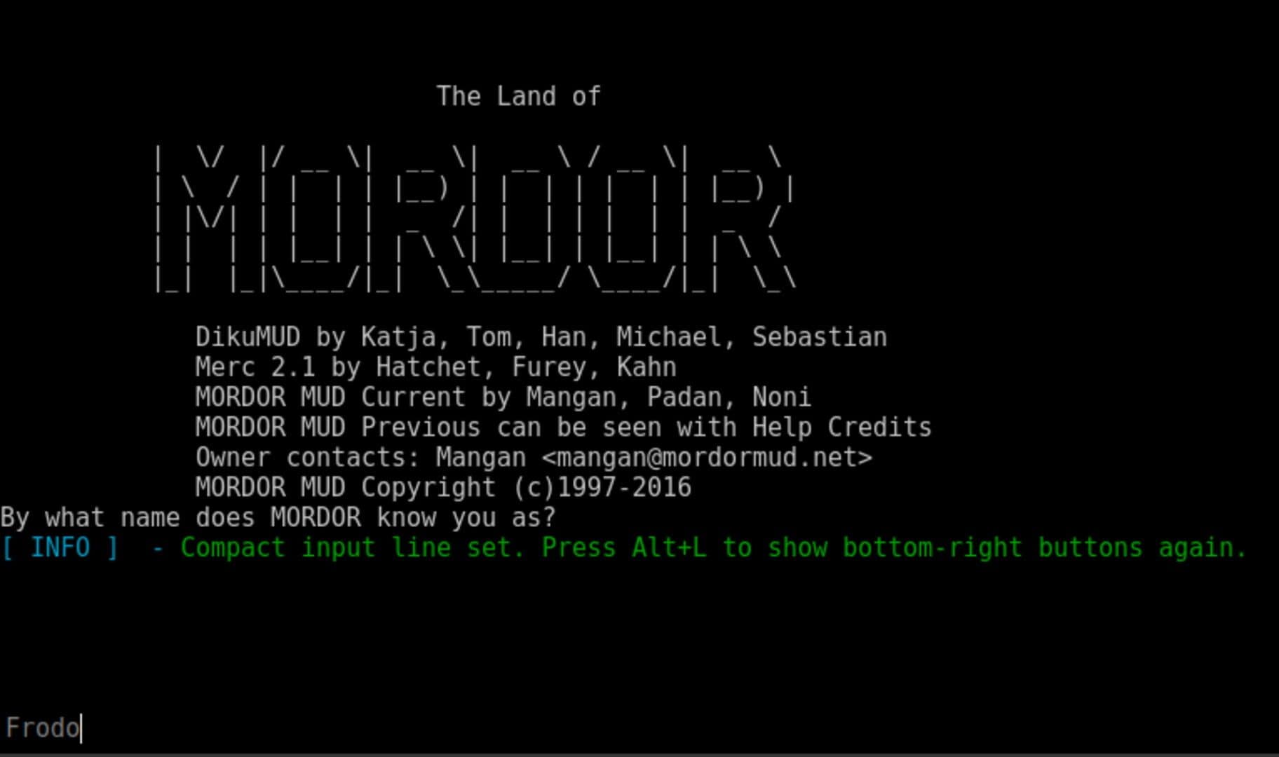 Mordor is a MUD based on the works of J. R. R. Tolkien, especially The Lord of the Rings and The Hobbit. While playing the game, you can explore over 75 unique areas including: Isengard, Edoras, Midgewater, Fangorn, Shelob's Lair, Lothlorien, Rivendell, Lonely Mountain, Helms Deep, Minas Morgul, and many more. New areas are added regularly. Mordor's unique multi-class system, along with its remort classes, allows you to completely customize your character. Role-play as good or evil and engage in player vs. player combat by joining an alliance, such as the Eye of Sauron, the Hand of Saruman, the Haradrims, the Last Alliance, the Northern Rangers, and the White Council. Solo and mercenary classes are also available, along with an alliance dedicated to helping out new players -- the Guardians of Mordor. All alliances are ever evolving through the expansion of their halls and the addition of new alliance-specific equipment. We have a full time Quest Master and often offer Immortal quests.