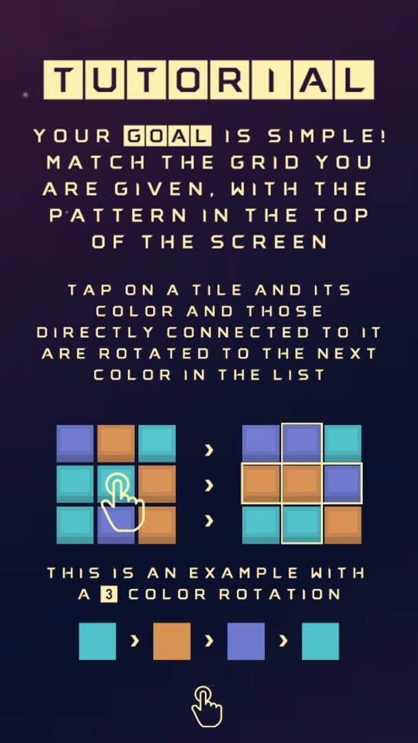 How many motivos("patterns" in Greek) do you think you can solve? Put your ingenuity to the test with Motivo! Motivo is mainly a color-based puzzle game but it comes with an option for colorblind mode. The perfect game to spend your free time or... those countless lecture hours. The mechanics are extremely easy to understand but you better think twice before tapping on a tile and rotate its color, you don't want to create a mess after all. When you tap on a tile, its color and those directly connected to it are rotated to the next color in the list. Simple, isn't it? All levels generated are guaranteed 100% solvable. What does Motivo offer you: - Countless hours of fun - Colorblind mode - 3 grid sizes - Up to 8 colors in a level - 30+ achievements to unlock - Addictive gameplay - Extremely easy mechanics - Nice relaxing ambient music Well... what are you waiting for?