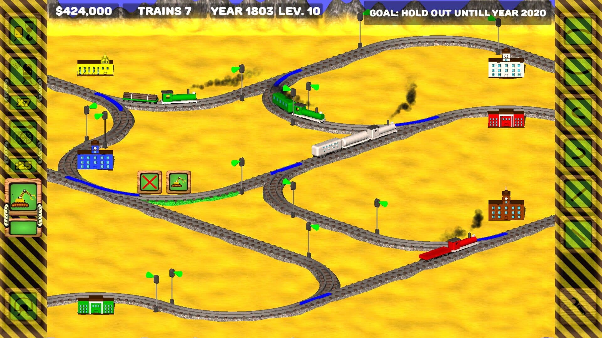 The main idea is the construction of the railway and train management. Game genre: puzzle and arcade elements. The game contains two parts - the main gameplay and the quest part. In the main gameplay the player needs to connect all the towns with each other using 6 kinds of rails. After that the player should direct trains between towns (the red train should go to the red town, and the yellow one - to the yellow one) using of railways switchers and traffic lights. Various relief obstacles (rivers and mountains) appear further in the game, as well as bridges and tunnels. Next we tried to create difficulties in the paths construction. There are only 6 rail shapes, so it is necessary to create additional loops or railway sidings for some cities connection (puzzle elements). Also there is a quest part in the game - the player can spend the earned money to restore locomotives in the hangar.
