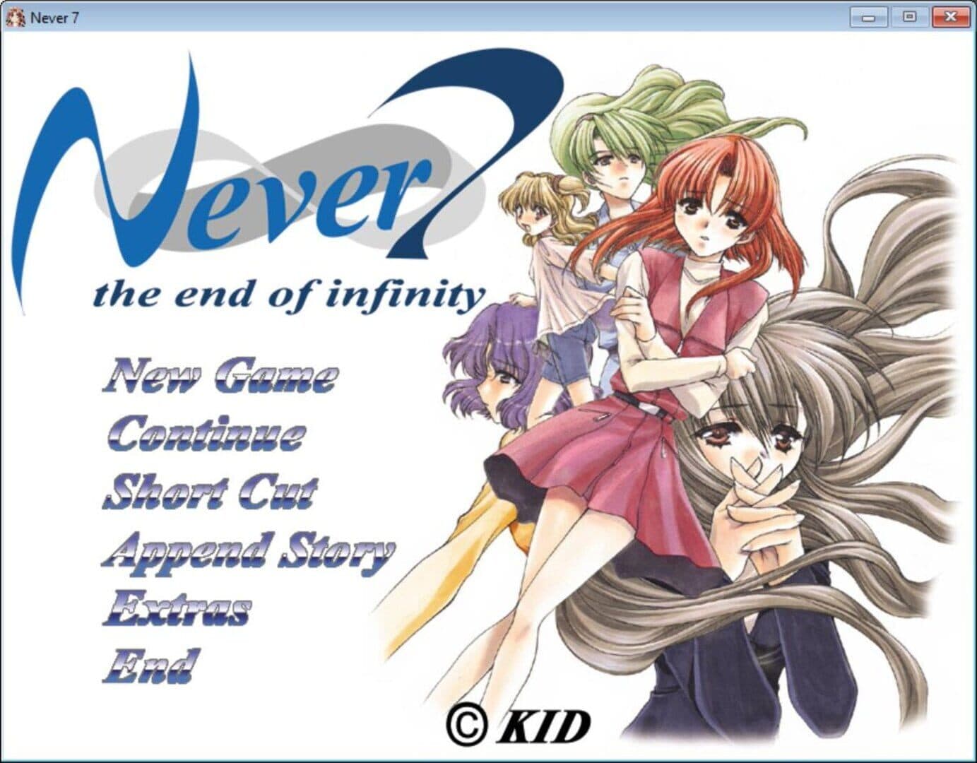Never7: The End of Infinity is the first title in the Infinity series, and is followed by Ever17: The Out of Infinity, Remembe 11: The Age of Infinity, 12Riven: The Psi-Climinal of Integral, and Code_18. In the game, the player takes the role of Makoto Ishihara, a college student who attends a seminar camp on an island together with three other students; he also befriends three other people who he meets on the island. The game takes place over the course of a week, and consists of the player reading the story, occasionally making choices that affect the direction of the plot; on the sixth day, one of the female characters dies, and the game moves back in time to the beginning, letting the player use knowledge from the first set of six days to make new choices, to try to prevent the character's death.