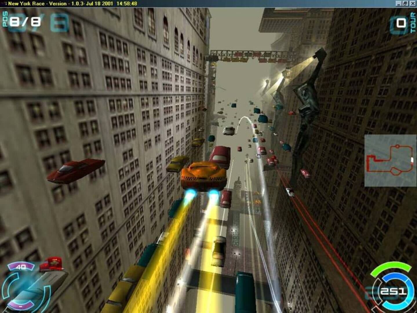 The player may choose between 25 unlockable vehicles, each with their own unique advantages and disadvantages, which fit into three categories: Speeders have good acceleration but weak shields. Hovercars are general 'all round' vehicles. Cruisers are very slow, but have extremely good shielding. In the game, New york is set not only to be large horizontally, it is also set to be large vertically for the city is several miles high as well as a few miles wide. Within the game, There are also 12 different courses around New York City, each being grouped into one of the four district groups which are: Middle Class Set in the middle parts of New York, fairly lively with middle class businesses and fairly bright. Jet Set Around the top of New York's very high towers bearing beautiful aesthetics, being quite lively and really bright. The Slums The base of New York's great towers, they consist of dirty areas such as Sewers or Dumps, they are very dark and foggy and hardly any traffic ever goes in the areas of this district group. Chinatown The Chinese district group of the city, bearing lively streets, very beautiful aesthetics and contains some parts of slight darkness and fair brightness.