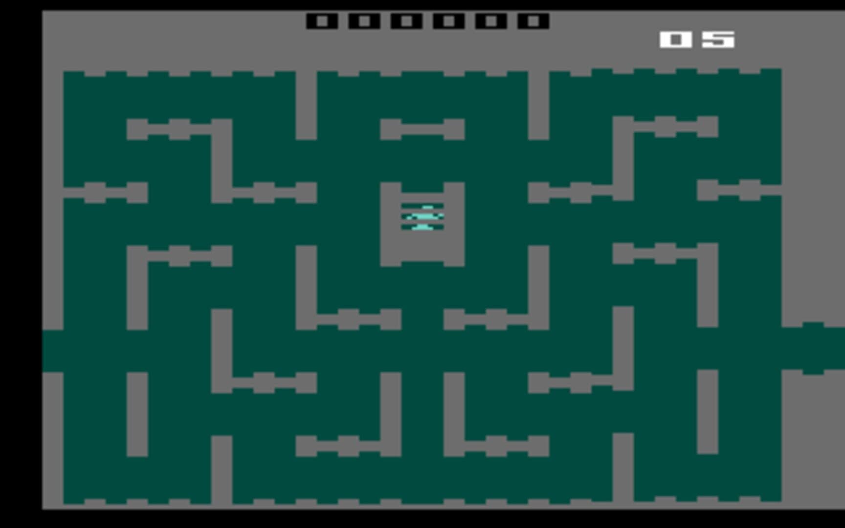 The player controls a man trapped in a hedgerow maze with no exits and many threats, some natural such as bats and spiders, others artificial and more deadly in nature such as robots. The player starts out in a bunker in the middle of the map completely defenseless. A gun icon flashes at one of five random locations which he must pick up to arm himself. Each gun has six bullets. Once the ammunition has been exhausted, the gun icon will appear again and the player must move defenselessly through the maze to retrieve the new weapon. There are five different robots that the man encounters in accordance with the point total. The terrain is filled with corners and ambush points that players must use to full effect. There is also a spider web in the northwest corner where the spider enemy spawns. Player movement is hindered here, and all firepower is heavily suppressed within, making it a strategic location. Also of importance is the player's bunker, in which the player begins each life. The bunker is a safe zone and the player is impervious to damage while inside, though the more advanced robot adversaries have the firepower to destroy this safe haven.