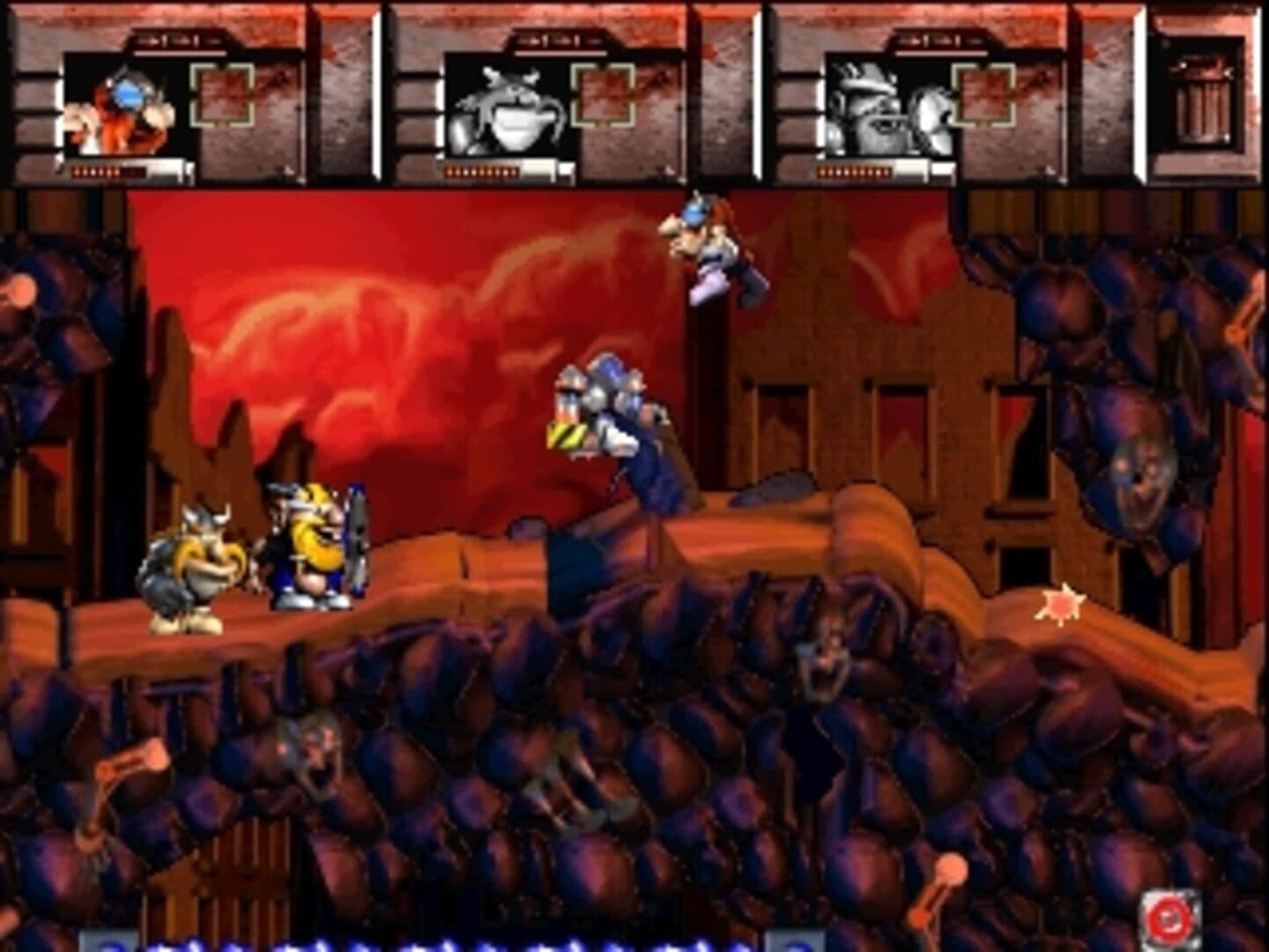 Lost Vikings 2 is a side-scrolling platform adventure in which the player alternates control of three of the five playable characters, guiding each of them one at a time from a designated start point in each level to the exit, collecting three specific items along the way. The game predetermines which characters are available in any specific level.[7] Control may be swapped from character to character at any point. In the two-player cooperative mode, each player simultaneously controls one character and is allowed to change control to the third, unused character at any point. Every level is designed such that each character must contribute his unique skills to help the other two through to the end. Similarly, to finish the level, all three characters must reach the exit point with the three items in possession.