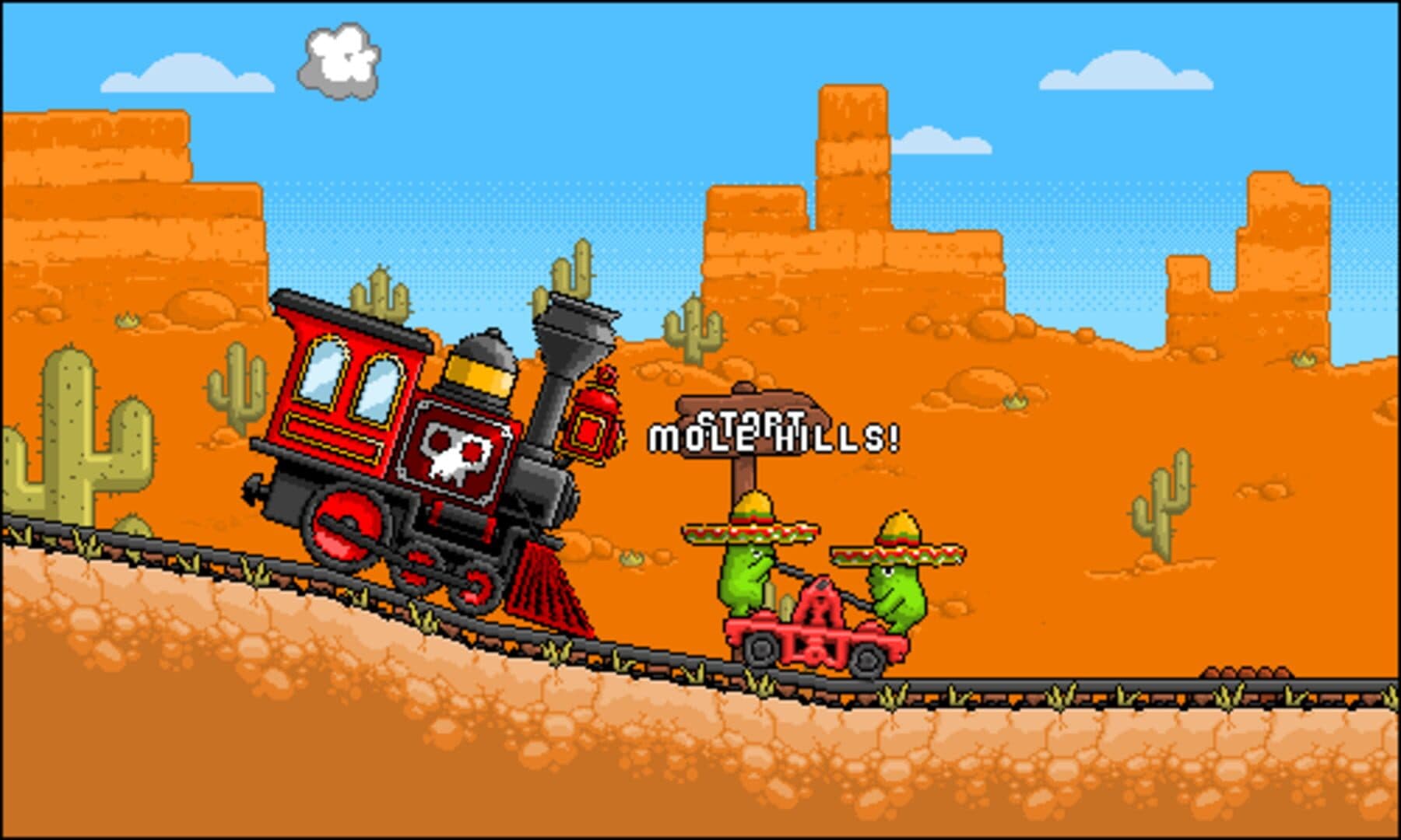 Hammer the buttons to power the hand car through each treacherous rail road.