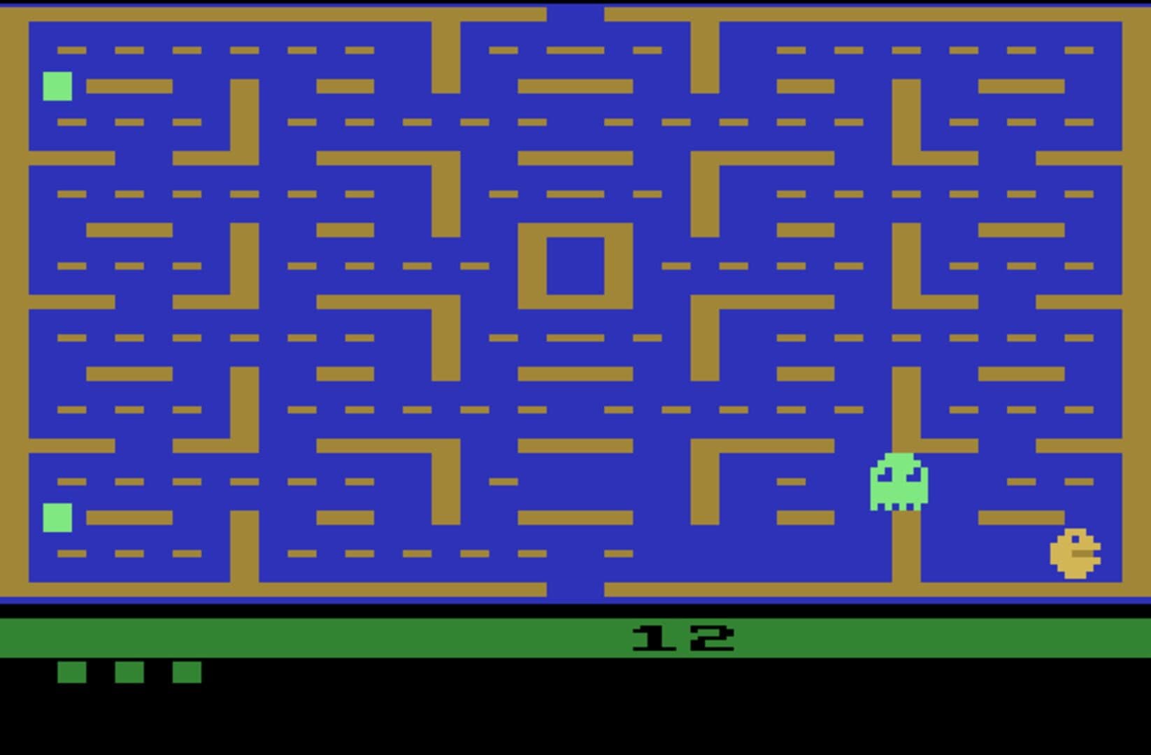 Atari 2600 Port of Pac-Man The player controls Pac-Man through a maze, eating pac-dots (also called pellets). When all pac-dots are eaten, Pac-Man is taken to the next stage. Between some stages one of three intermission animations plays. Four enemies (Blinky, Pinky, Inky and Clyde) roam the maze, trying to catch Pac-Man. If an enemy touches Pac-Man, a life is lost and the Pac-Man itself withers and dies. When all lives have been lost, the game ends. Pac-Man is awarded a single bonus life at 10,000 points by default. Near the corners of the maze are four larger, flashing dots known as power pellets that provide Pac-Man with the temporary ability to eat the enemies. The enemies turn deep blue, reverse direction and usually move more slowly. When an enemy is eaten, its eyes remain and return to the center box where it is regenerated in its normal color. Blue enemies flash white to signal that they are about to become dangerous again and the length of time for which the enemies remain vulnerable varies from one stage to the next, generally becoming shorter as the game progresses. In later stages, the enemies go straight to flashing, bypassing blue, which means that they can only be eaten for a short amount of time, although they still reverse direction when a power pellet is eaten; in even later stages, the ghosts do not become edible (i.e., they do not change color and still make Pacman lose a life on contact), but they still reverse direction.