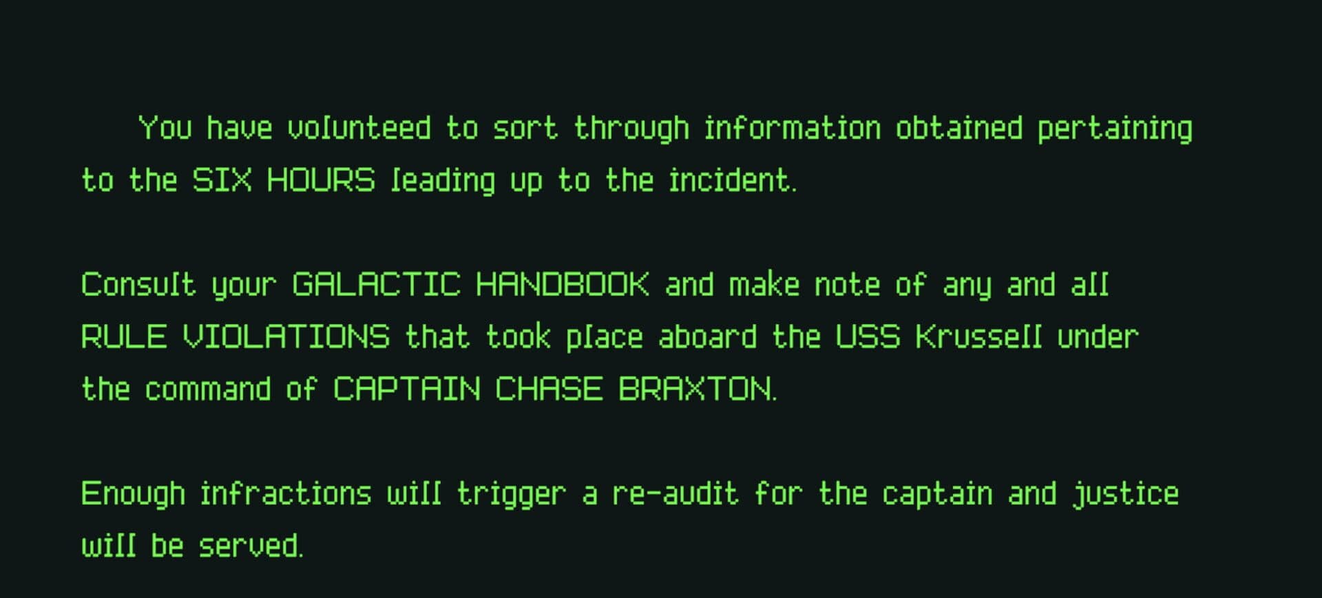 You are a Compliance Officer for SPACEFLEET. Search for clues on your Compliance Console. Open your dossier to assemble your investigation, check your work, and bring Captain Braxton to justice. Click and Drag until the truth is revealed.