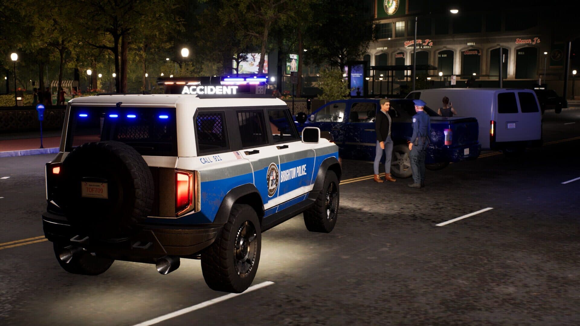 The Warden Police Vehicle features a light bar on top that can display messages for securing accident sites at night, as well as for setting up road blocks or signaling traffic offenders to pull over.