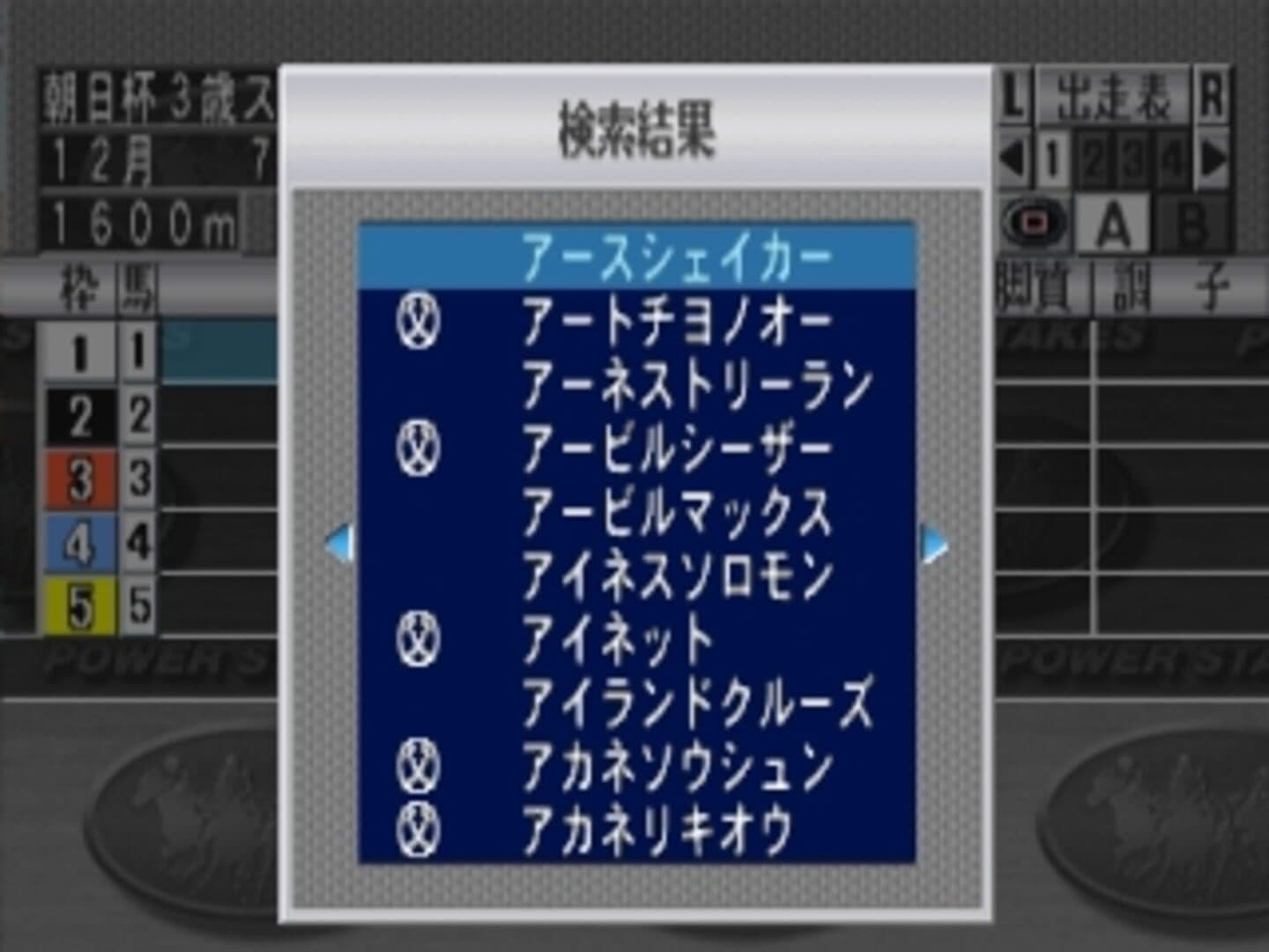 Power Stakes Grade 1 is a Sports game, developed by TOSE and published by Aques, which was released in Japan in 1997. Horse Racing (US) or horseracing (UK) is an equestrian sport that has been practiced for millennia. It is inextricably associated with gambling. The common sobriquet for Thoroughbred horse racing is The Sport of Kings. Horse racing is an equestrian sport and major international industry, watched in almost every nation of the world. There are three types: "flat" racing; steeplechasing, i.e. racing over jumps; and harness racing, where horses trot or pace while pulling a driver in a small, light cart known as a sulky. A major part of horse racing's economic importance lies in the gambling associated with it, an activity that in 2008 generated a world-wide market worth around US$115 billion. Japan conducts more than 21,000 horse races a year in one of three types: flat racing, jump racing (races over hurdles), and Ban'ei Racing (also called Draft Racing). There are a total of thirty racetracks in Japan. Ten of these tracks are known as "central tracks", where most of Japan's top races are conducted. Races at these ten tracks are conducted by the Japan Racing Association (JRA), which operates under the oversight of the Japanese government. The remaining twenty tracks are operated by municipal racing authorities and run under the affiliation of the National Association of Racing (NAR). Two tracks, Sapporo Racecourse and Chukyo Racecourse, run separate meetings under either JRA or NAR jurisdiction. Power Stakes Grade 1 is the second game in Tose Software game series featuring the new data of the new season over the previous game. The game again features the 3d engine to watch the race in different camera angles that the player select in the game main menu.
