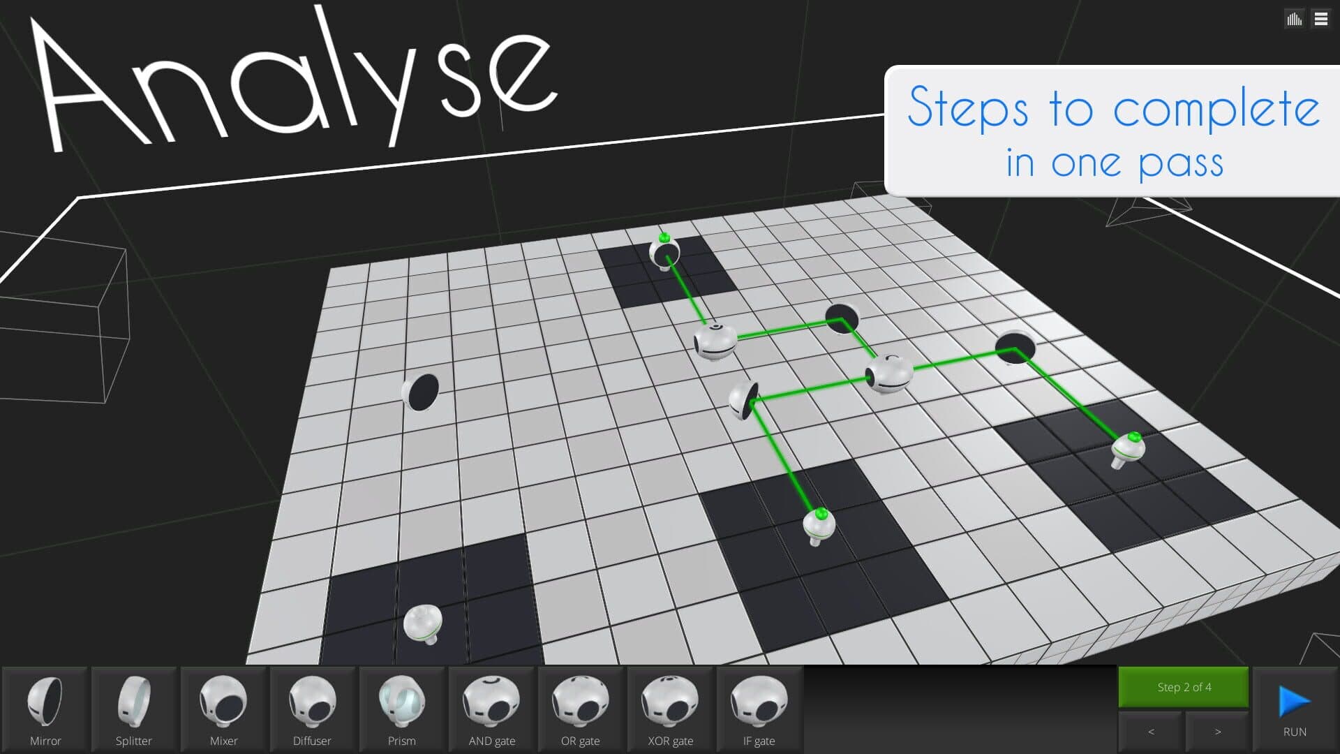 Prelogate is a logic puzzle game. Solve puzzles by redirecting laser beams, mixing them and controlling them with logic gates.