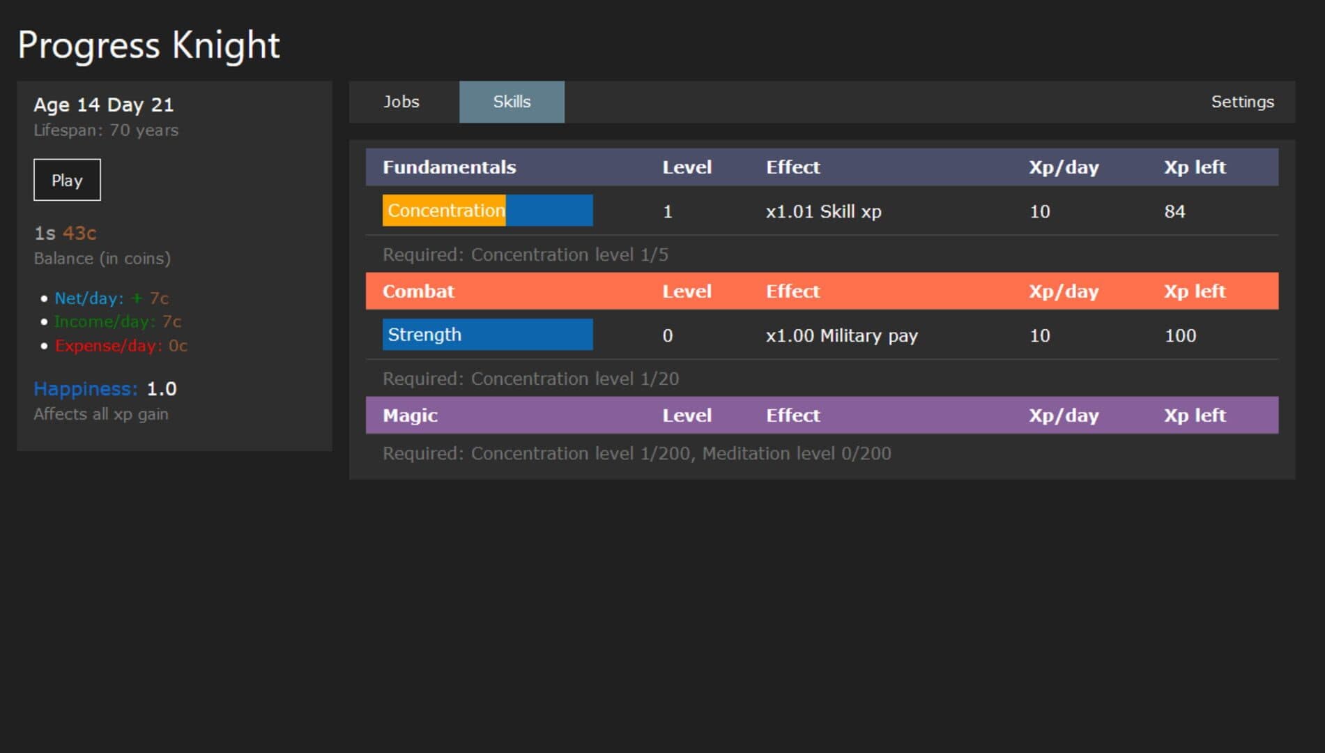Progress Knight is a life-sim incremental based in a fantasy/medieval setting, where you must progress through the career ladder and acquire new skills to become the ultimate being. You first start off as a beggar, barely being able to feed yourself as the days go by. However, over the years you learn new skills and gain plenty of work experience to enter new high paying jobs while managing your living expenses...