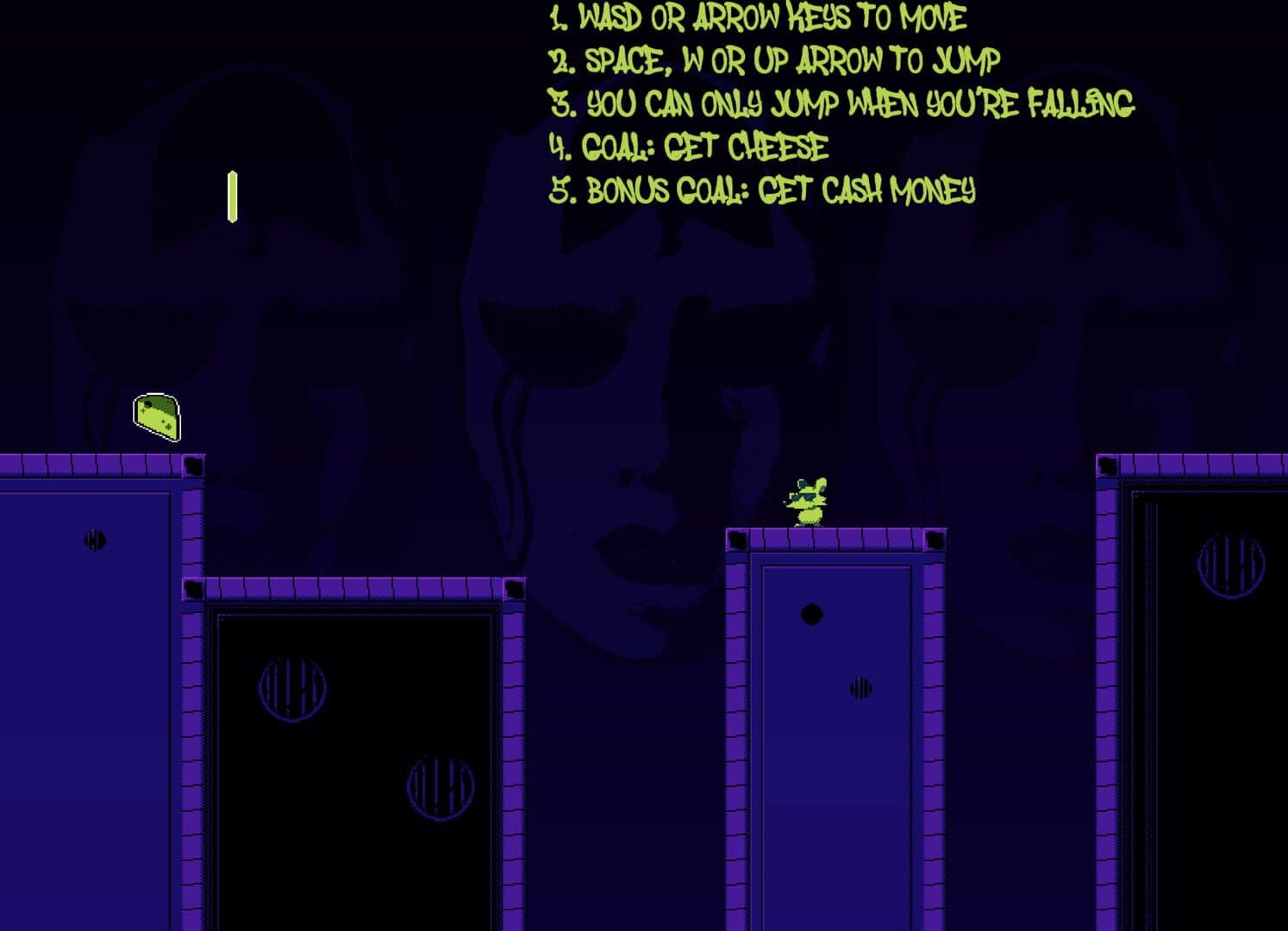Rat Wrap is a single-screen precision platformer, where you can only jump when you're off the ground and are able to wrap about the screen (hence the name). You are THE RAT and you must get THE CHEESE, that's all you need to know!