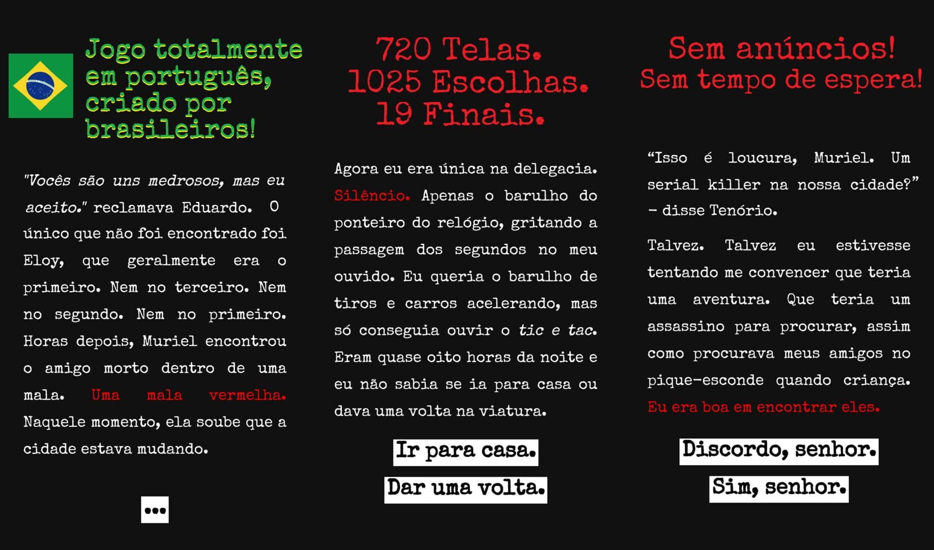 In "Red Suitcase" you will live the story of Officer Maisie. Understood in the small town, Maisie has her life changed when a red suitcase appears in the middle of town. It is the beginning of Maisie's adventure, trying to capture an assassin, before he finishes his plan. You will make the decisions during the investigation, taking Maisie to several places in the city, in search of clues to uncover the pattern of the killer. Face not only the killer, but also the citizens of the city.