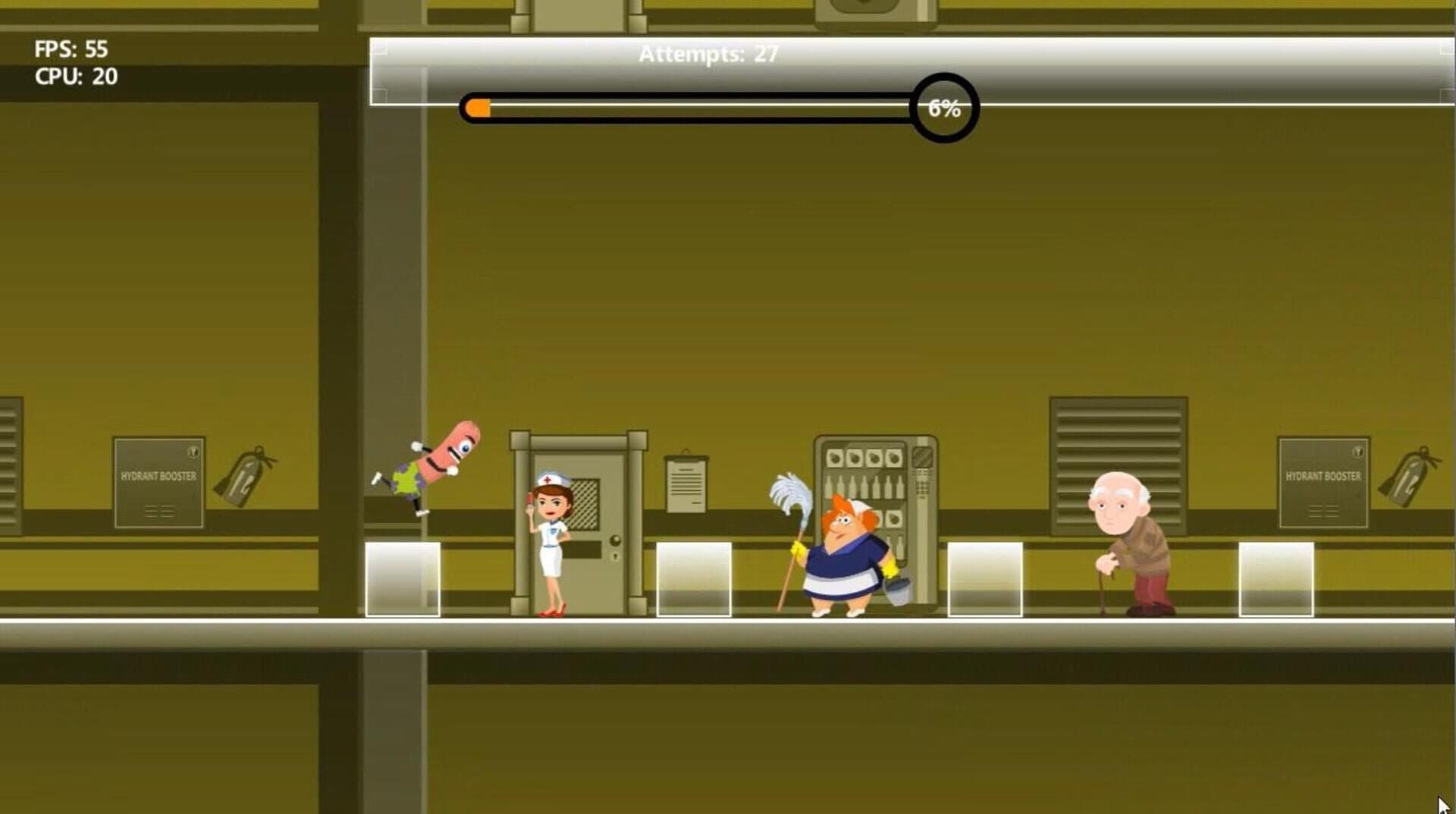 You play for crackheaded sausage which wants to survive and not to get in hotdog. Set of obstacles and enemies. Different types of the equipment.