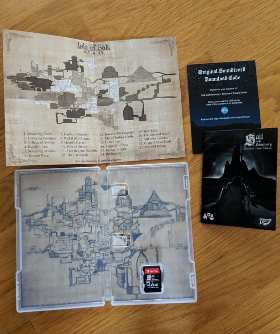 A physical version of Salt and Sanctuary released for the Nintendo Switch. It includes a Nintendo Switch game cartridge, a full manual, a double-sided mini poster featuring the Sodden Knight on one side and a hand-drawn world map of the island on the other, and a download code for the Salt and Sanctuary original soundtrack.