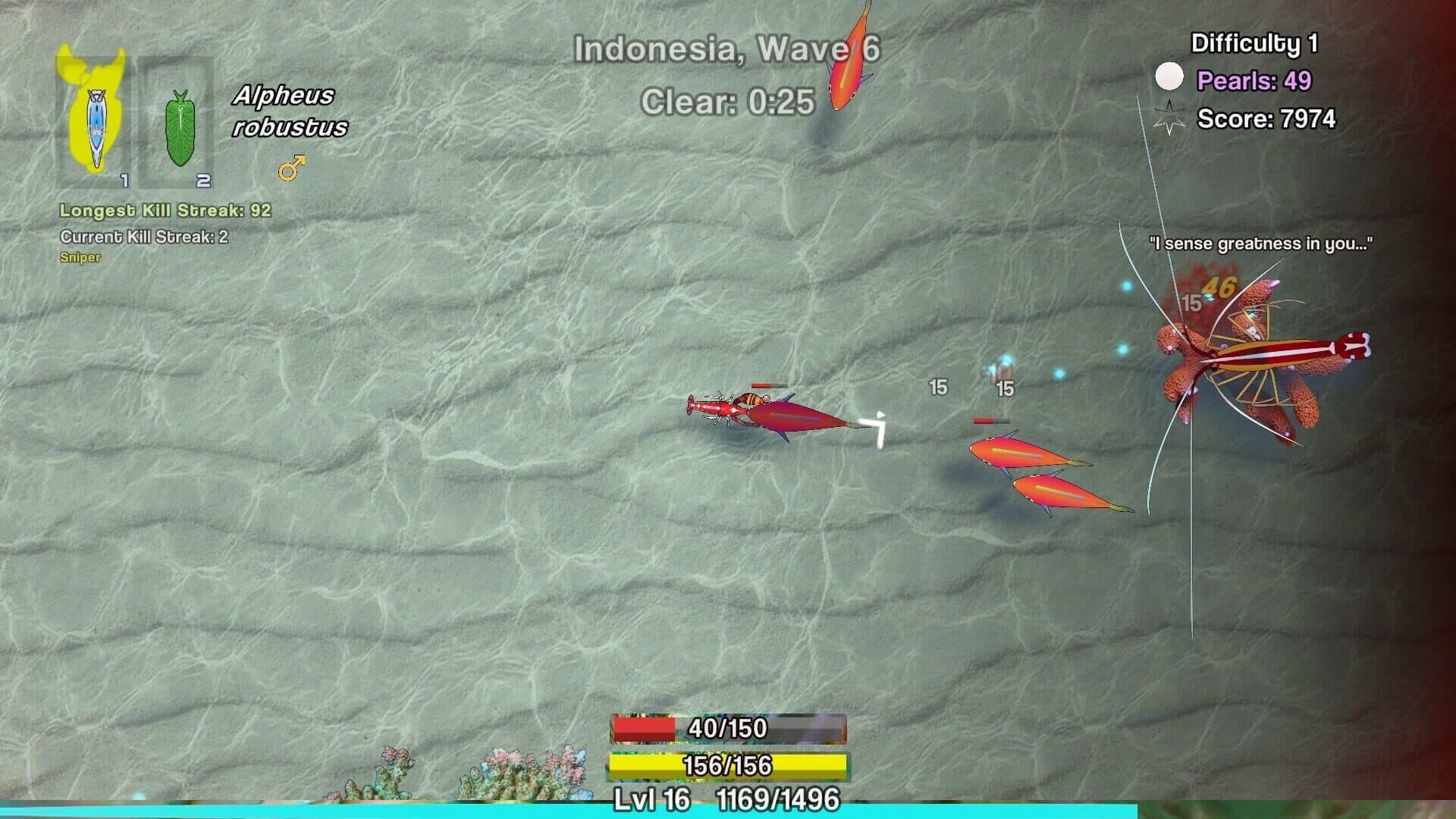 Play as a pistol shrimp and survive waves of enemies while collecting pearls from oysters scattered throughout the map.