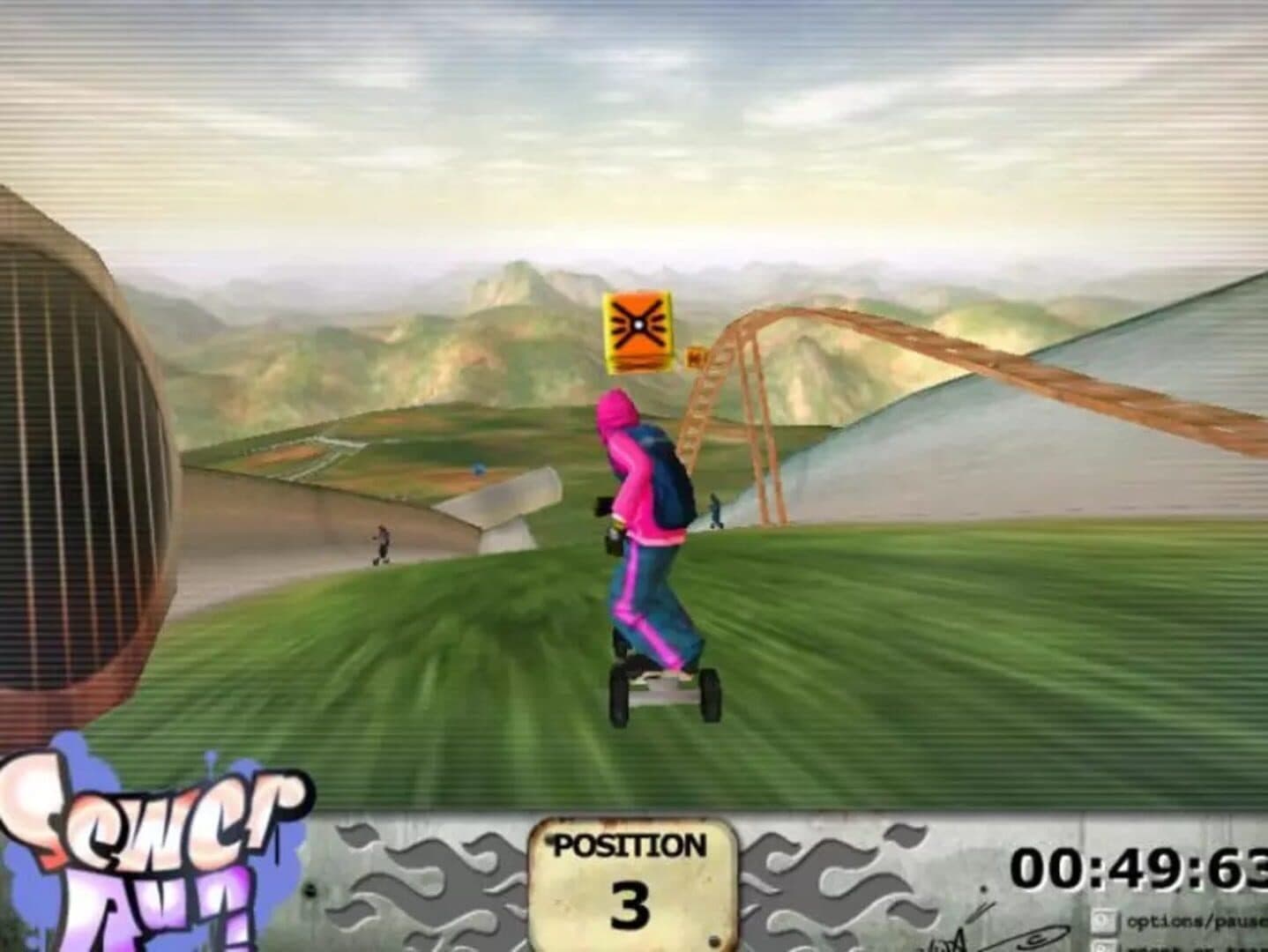 A Shockwave player game about skateboarding through sewers and jumping off ramps while picking up super powers to hinder fellow skateboarders.