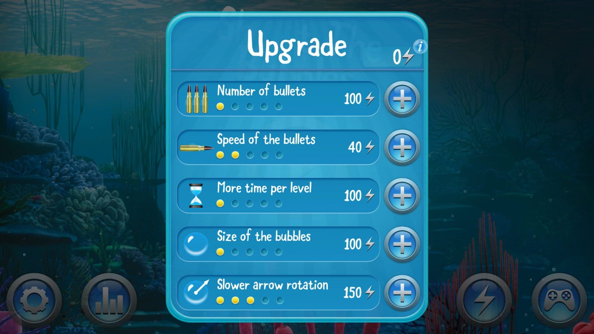 Shoot The Bubbles Deluxe is the fast and furiously fun bubble shooter that’s all about popping bubbles! Gameplay is very simple, you just need to tap the screen when crosshair arrow is pointed on any bubble on the screen. There is no strict order which you need to follow when you popping bubbles. You need to figure out the easiest and the fastest way to pop all the bubbles on the screen. Every level is possible to complete in multiple ways. Score is directly dependent on time that is left after completing the level. With better score you will gain more level stars and for every star you will gain 10 upgrade points that can be used to get more bullets, more time per level and to slow down rotation of the crosshair arrow.