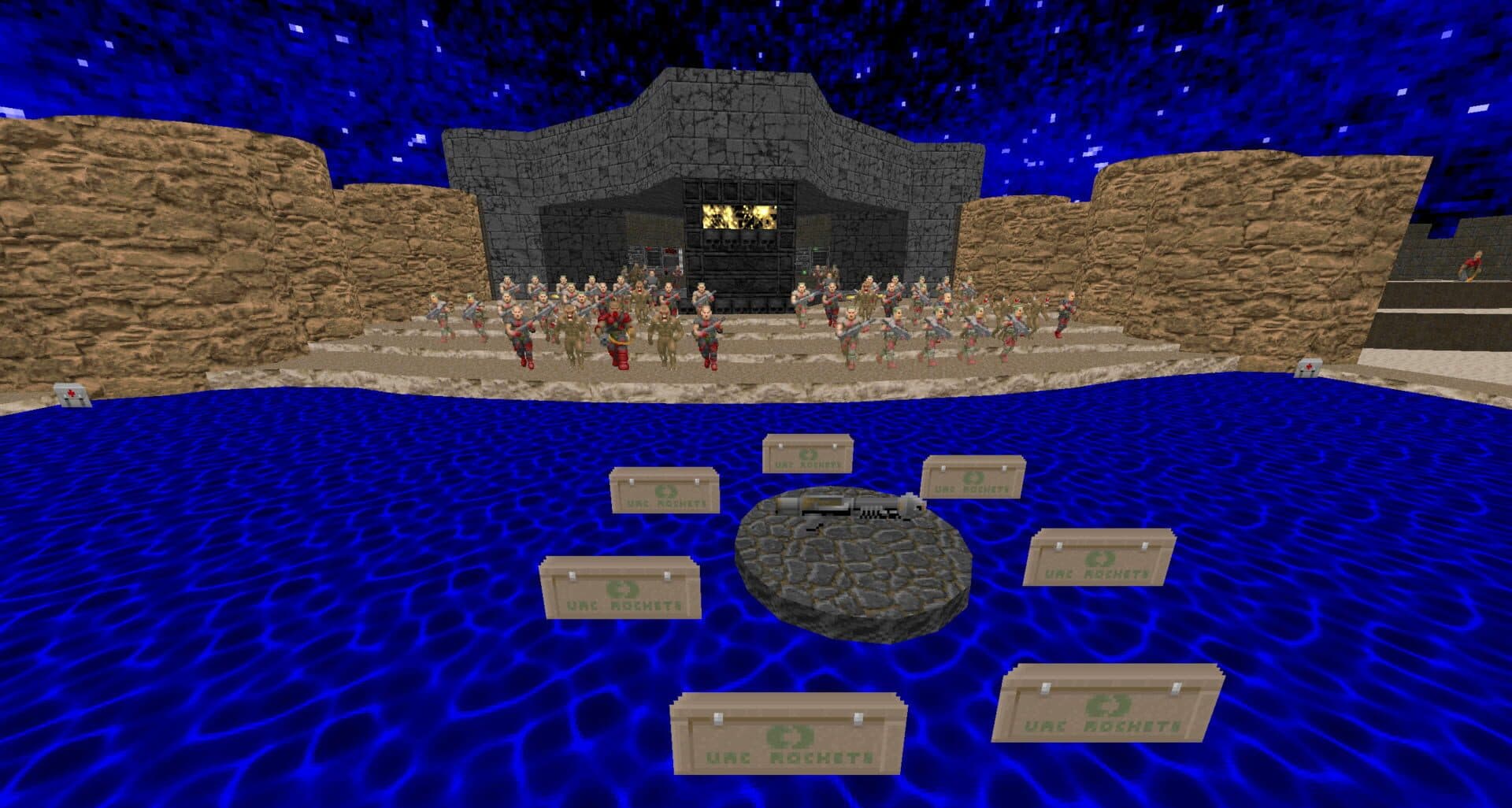 Six Minute Showdown is an unique DOOM II map by Vytaan featuring rhytmic elements. The map responds to the music's beat and will end at exactly six minutes, it requires quick reaction time as well as developed combat skills to keep up the pace.