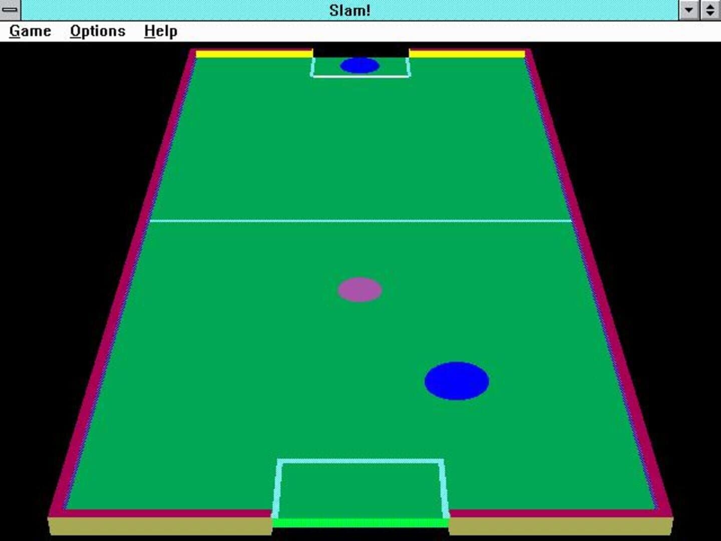Slam! is a Windows-based (3.x) simulation of the popular table game of air hockey. Players can customize opponents skills with the ability to change aggressiveness and quickness from 1 to 99, change view angle from zero to 90 degrees, turn sound on/off and have a choice of default color or monochrome default (black and white) coloring. You control your paddle with the mouse, and by right clicking players can enter the options menus.