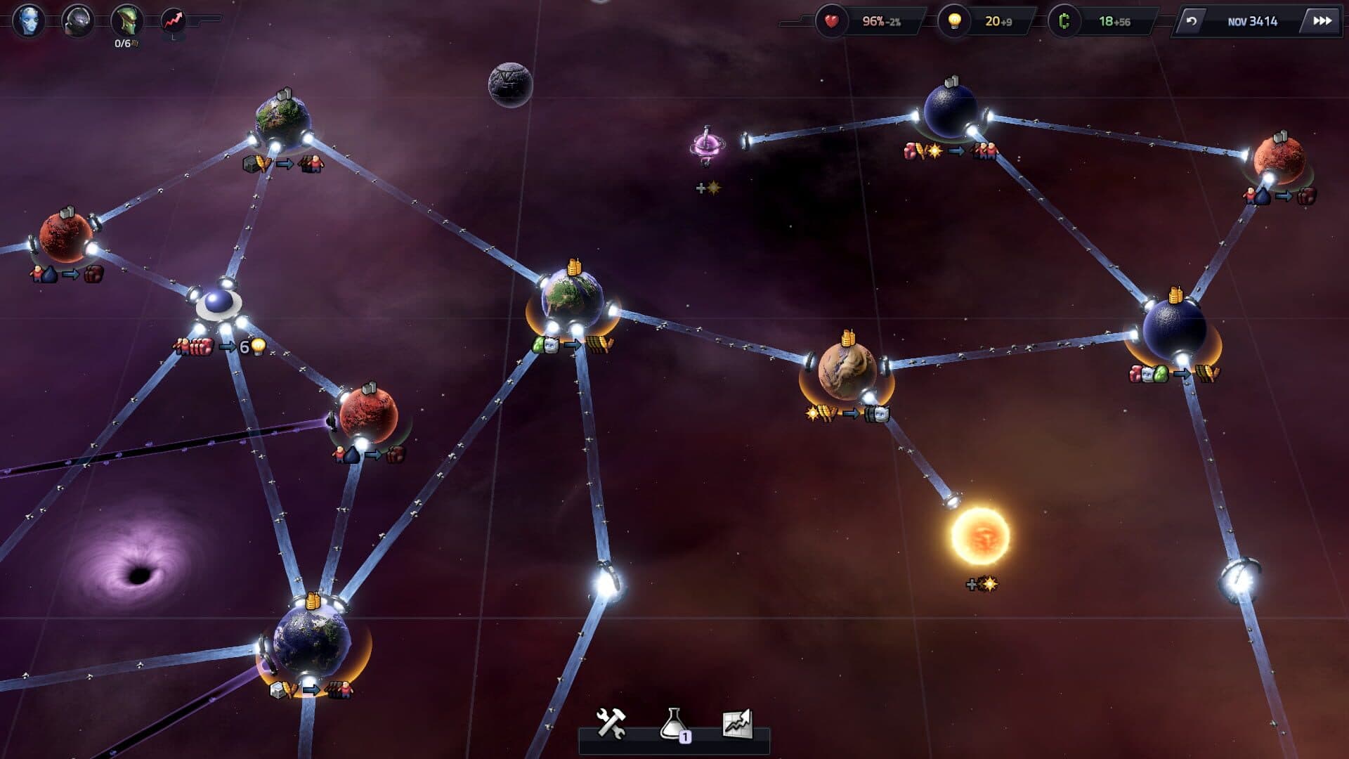 MAKE TRADE, NOT WAR Colonize planets, carefully pick industries and hook everything up so that your planets support each other. Line everything up just right and watch your colonies evolve and grow, giving you even more options for profitable trade. Make long-term plans and bask in your own glory when that one last connection makes six planets upgrade at the same time and gives you the income you desperately need. There is no military aspect to pull your focus away from the economy. The game is more relaxed than your typical grand strategy. It's all about exploring space and its endless opportunities, shaping it to your whim and developing it to its full potential. No need for war with so much empty universe to claim. FASTER THAN LIGHT Forget about tedious micromanagement and waiting for ships to be built. In Slipways, every action you take has immediate consequences, and every choice you make is of paramount importance. Your planets govern themselves while you focus on making the right decisions to get them what they need. You'll waste none of your precious time on busywork. A single run takes 40-60 minutes and they are all filled with the good stuff. TECH IT UP A NOTCH There are no boring technologies here. Instead of making a single building 20% more efficient, technologies in Slipways let you move planets at will, harness stars for energy or colonize planets with sentient machines instead of people. The selection varies each run, so you'll have to plan carefully and adapt to the situation at hand. The path you choose will profoundly change your experience and the way you look at the game's planets and resources.