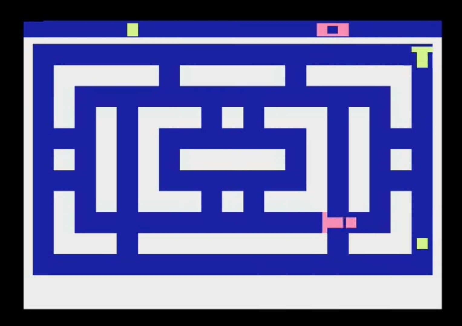 Slot Racers is a joystick-controlled action game, with a total of nine game variations programmed within the cartridge. The object of the game is to pilot your car through a maze, while attempting to fire missiles at your opponent's car, as well as evading the missiles your opponent fires at your car. Each time one of the respective cars is struck by a missile, the player controlling the other car receives one point. Victory is achieved through the scoring of twenty-five points. The game itself has four different mazes, and options concerning missile speed, and other factors, within the context of its nine variants, selectable via the Game Select switch. The Difficulty Switches control the rate of fire each car is capable of.