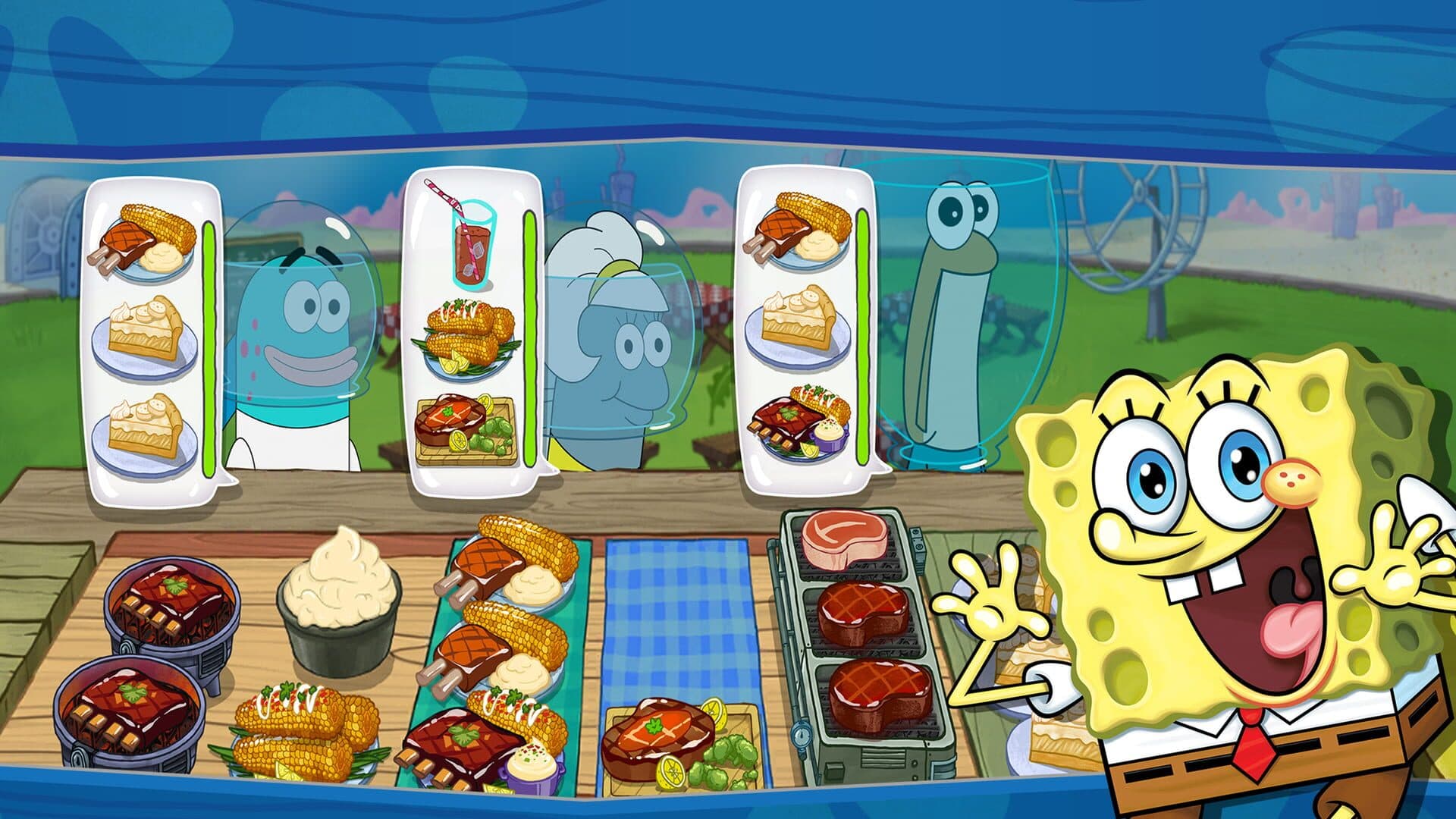 Fire up the grill! Delight customers by serving up delicious dishes in Bikini Bottom's restaurants in this culinary adventure based on the series. When Mr. Krabs realizes there’s more money to be earned in the fast-food business, the penny-pinching restaurateur sets out to expand his empire — starting with a breakfast stand outside of SpongeBob’s house. Who better to help Mr. Krabs run his business than SpongeBob SquarePants himself? Play as SpongeBob to create your own Bikini Bottom kitchen, decorate and customize your restaurant, and get ready to serve your guests delicious food! In this fast-food cooking game, put your time-management skills to the test and experience an expanded SpongeBob universe.