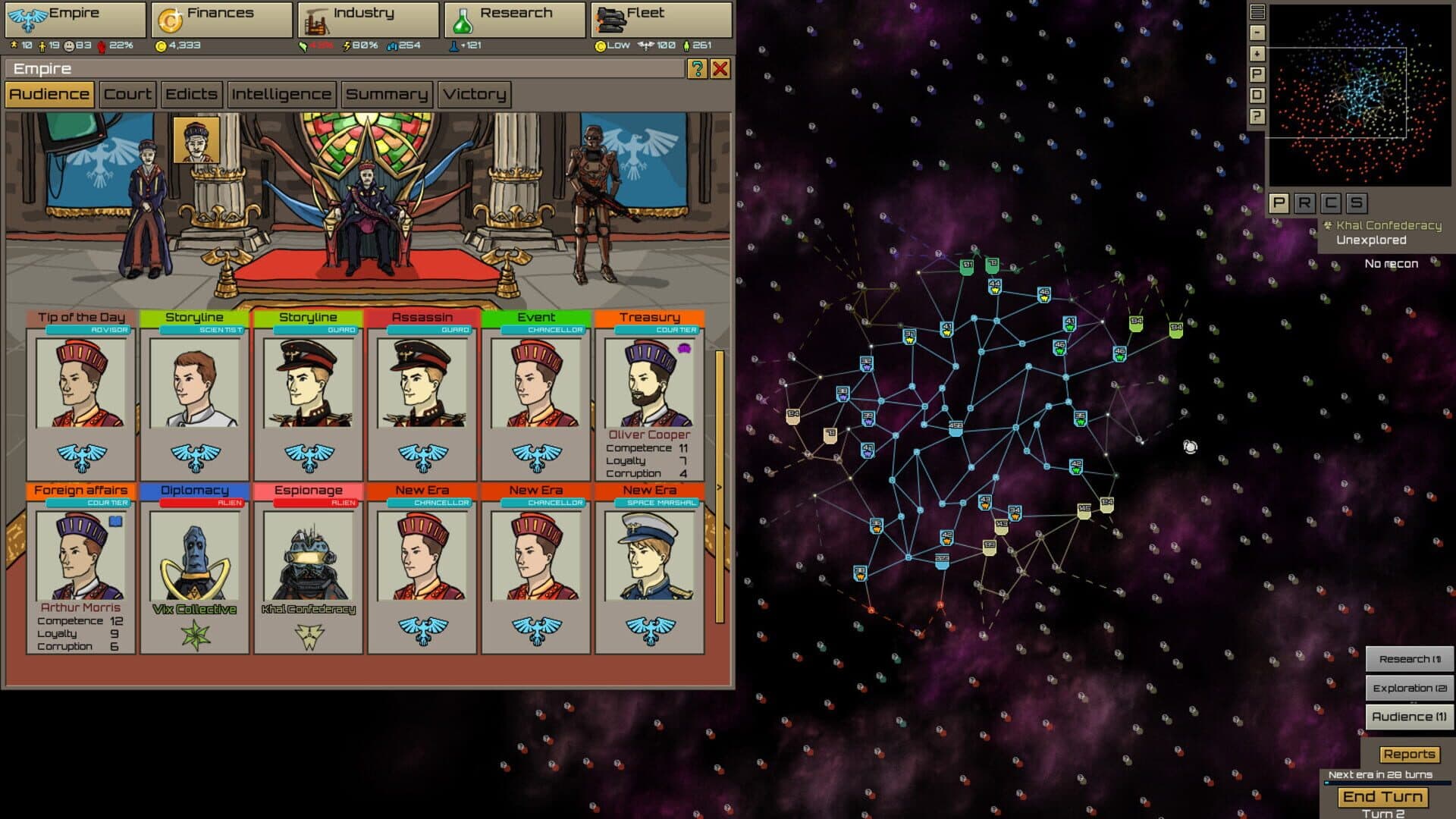 Asymmetric space empire builder where you feel like the Emperor, not a logistics officer. No micromanagement, grand scale, fast paced, audiences, assassins, imperial court, disloyal admirals.