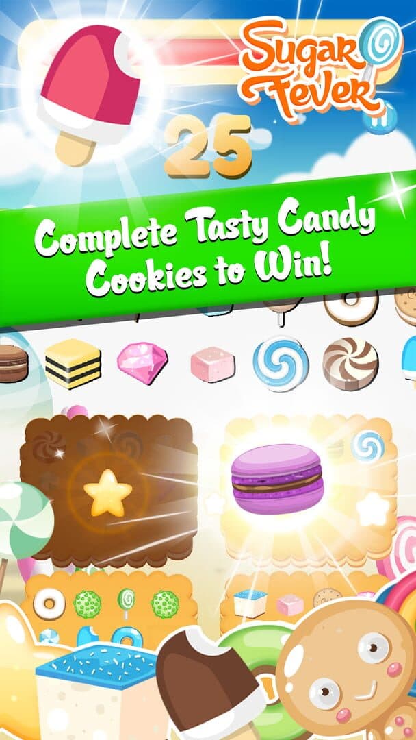 Sugar Fever, a fun game that will test your reflexes and speed. Join a journey full of sweet and sugar, match candies, make incredible combos, score points and complete missions to become the best Sugar Fever player in the world in our world rankings. Dozens of achievements are waiting. Challenge your friends and prove you are the best! Playing is very easy, select the sweets passing though the top and then touch the cookie to which they belong. For each cookie you complete, you will get one point and reach another level. Complete all the cookies to get more points and time, but hurry up, time is going faster and faster after every level. Remember that you can make combos of 3 or more candies to get bonuses. Play alone or against your friends to see who gets the highest score. You don't need internet connection to play, you can play wherever you want and when you want. Features of Sugar Fever: - Time trial mode. Complete cookies to get more time. - Very easy to play, but very complicated to master. - Dozens of missions and achievements. Do you think you can overcome them all? - World ranking, so you can compare your score with your friends and competitors. - Endless game, How far can you get? - Combos, special moves to get more time. - Hundreds of candies and sweets are waiting for you. - Share a screenshot of the score with your friends. - Totally free, no need for extra purchases to play at all.