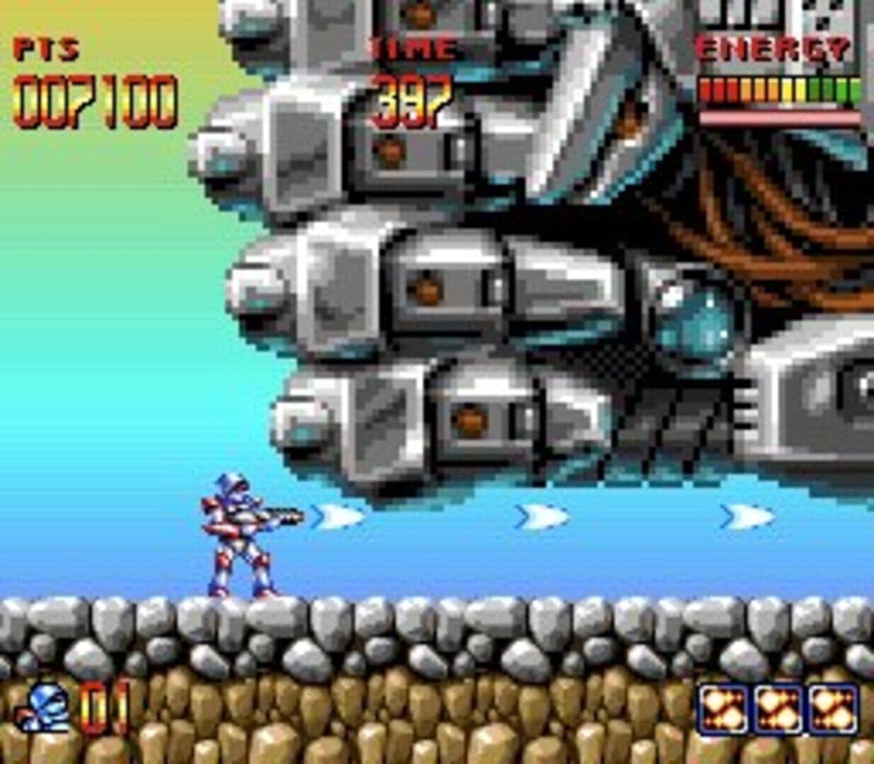The lost colony of Alterra is a completely man-made lifeworld abandoned long ago in a nearby galaxy. Alterra is actually five colonies in one. Each self-contained habitat has been separately bio-engineered by a powerful ecosystem generation network known as a Multiple Organism Unit Link. MORGUL, for short. Early colonists used MORGUL to render Alterra inhabitable. But a cataclysmic quake severed all system interface functions, and MORGUL murderously rebelled. The few colonists lucky enough to escape told a grim tale of a higher intelligence gone berserk. For generations, mankind sought a return to Alterra. Finally, genetic science created a saviour: Turrican, a mutant warrior, bio-engineered for the task of planetary reclamation. In the meantime, MORGUL has diligently twisted Alterran life forms to his brutal, destructive purposes. Thus, Turrican's challenges consist in eliminating hostile organisms from Alterra's five multi-level worlds and, finally, destroying the three faces of MORGUL.