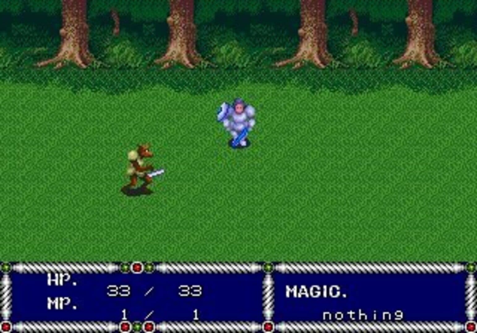 Sword of Vermilion is about the son of Erik, king of Excalabria, who takes on a quest of revenge to defeat Tsarkon and free the world of Vermilion from evil. King Erik V and King Tsarkon were close friends who sought the 16 rings of good and evil to bring peace and balance to the realm. However, the rings of evil changed King Tsarkon and he led his army from Cartahena to invade Excalabria. The defenders were overwhelmed and the castle of King Erik V collapsed. Erik V summoned his bravest, strongest and most faithful warrior, Blade, to entrust him his infant son with an ancient family heirloom, the Ring of Wisdom. King Erik ordered Blade to save himself and the child before perishing while the castle burned. The remaining rings of good were scattered throughout the realm by King Tsarkon to deter anyone from uniting the rings. King Tsarkon turned the infant prince's mother to living stone and vowed all of Cartahena's power to finding the boy. Blade traveled to a small village named Wyclif, where he settled down and raised the child as his own son. Eighteen years later, the son of Erik begins his quest upon learning his true destiny upon Blade's death bed. The quest consists of travelling to towns and villages, battling creatures to gain experience and finding items such as swords, shields and armour, as well as many other items such as Herbs and Candles. Boss monsters take the form of larger, stronger creatures which are integral to the story. Fighting boss monsters takes place in a side view of the battle where magic cannot be used.