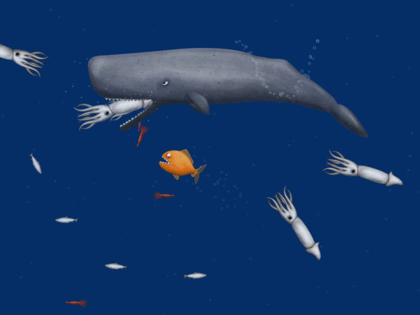 Tasty Blue is an underwater side-scrolling eat 'em up game. You start as a small goldfish with an insatiable appetite. After being overfed by your owner, you'll escape into the ocean and eat everything that you encounter. The more you eat, the bigger you get! In addition to the goldfish, you'll also play as a dolphin and a shark. The dolphin starts off as an overworked aquarium star, forced to jump through flaming hoops for food. He escapes from captivity by eating his way through the aquarium and taking revenge on his trainer. The shark is the final playable character, an artificial fish created by scientists to save Earth's oceans. It uses self-replicating nano technology to consume everything in its path and convert their matter into its own. There's no telling how big this shark will get. There are over 50 levels in the main story mode of the game. There are also 15 more challenging bonus levels to play after the main game has been completed. There are three main environments to explore in the game: temperate, tropical, and arctic. There are a wide range of difficulty levels to choose from. On the easiest difficulty enemies do virtually no damage. On the most challenging difficulty enemies will eat you and cause instant level failure. Two players can play side by side on the same computer. Options allow for split screen (horizontal or vertical) or shared screen (this provides more screen space but constrains the movement of players together).