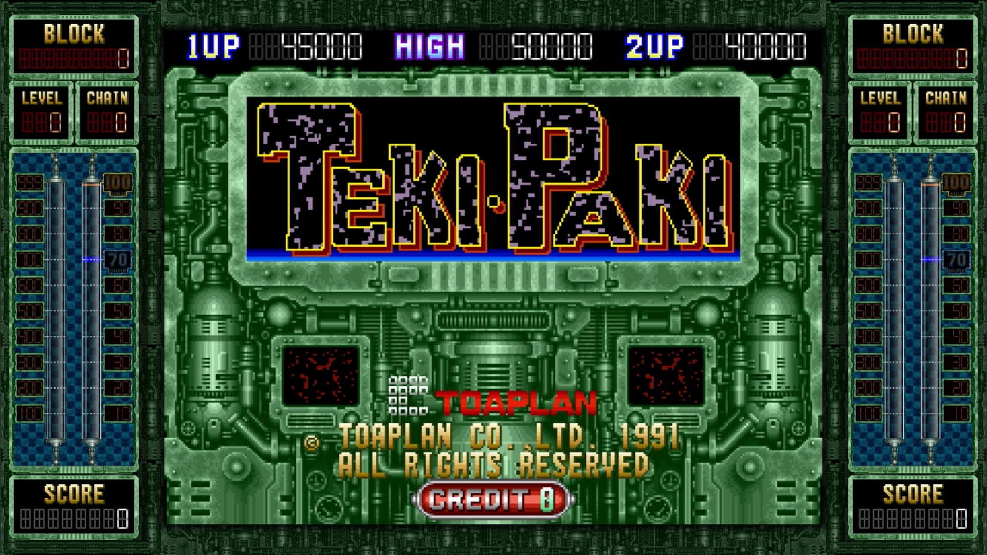 A falling block puzzle game, Teki-Paki is based around creating strings of 5 or more blocks vertically, horizontally or diagonally. The player drops L-Shaped 3-block pieces onto the game field. If the screen is filled, the game is over.