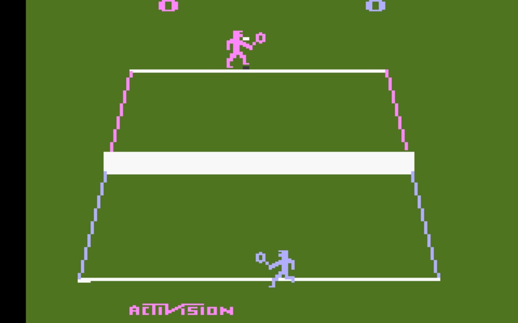 Tennis offers singles matches for one or two players; one player is colored pink, the other blue. The game has two user-selectable speed levels. When serving and returning shots, the tennis players automatically swing forehand or backhand as the situation demands, and all shots automatically clear the net and land in bounds. The first player to win one six-game set is declared the winner of the match (if the set ends in a 6-6 tie, the set restarts from 0-0). This differs from professional tennis, in which player must win at least two out of three six-game sets.