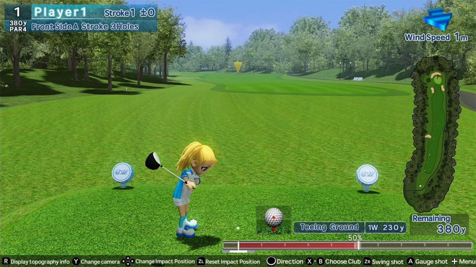 A fun and simple golf game anyone can enjoy. Includes golf courses with up to 18 holes. With support for 1-4 players, enjoy at your pace by yourself or have an exciting competition with your friends and family. You can play with either the controller or by swinging the Joy-Con.