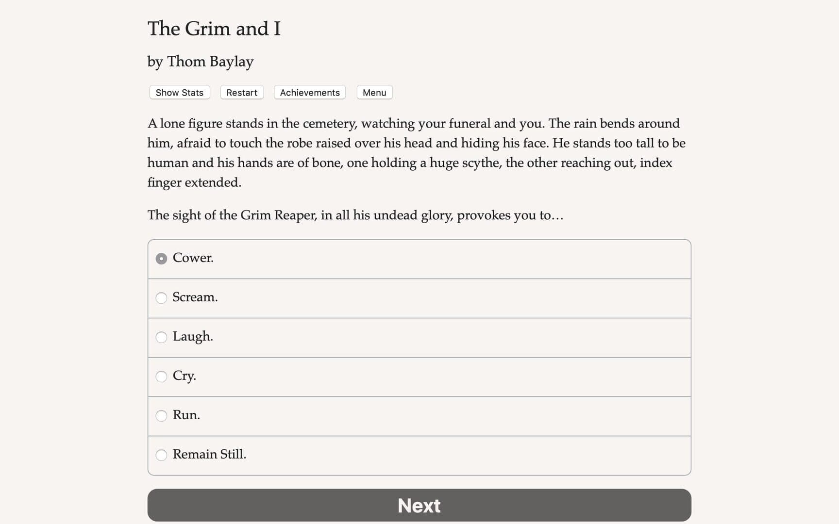 The Grim and I is a unique 155,000 word interactive novel, where your choices control the story. It's entirely text-based - without graphics or sound effects - and fueled by the vast, unstoppable power of your imagination.