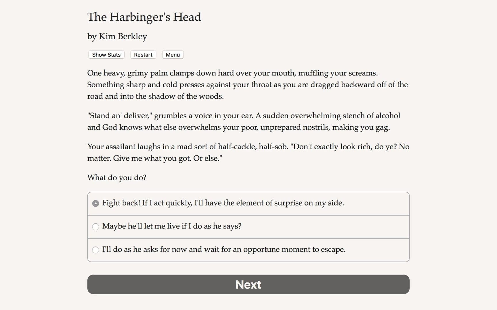 The Harbinger's Head is a fantastic 46,000 word interactive horror novel by Kim Berkley, where your choices control the story. It's entirely text-based - without graphics or sound effects - and fueled by the vast, unstoppable power of your imagination.