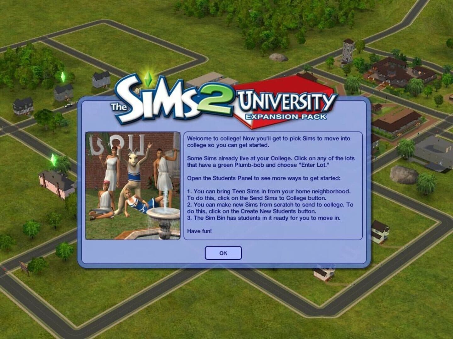 The Sims 2: University is the first expansion pack for the life simulation game The Sims 2. Your Sims are now young adults leaving home to live the ultimate college fantasy. Immerse them in college life as they become the Big Sim on Campus. They'll relish their new-found freedom as they party with friends, join fraternities and sororities and pull outrageous pranks. Your Sims will explore all the campus hot-spots as they frequent lounges, gyms, coffee houses and more. Help them fulfill new lifetime goals to unlock more rewards and reap all of the benefits of their university years.