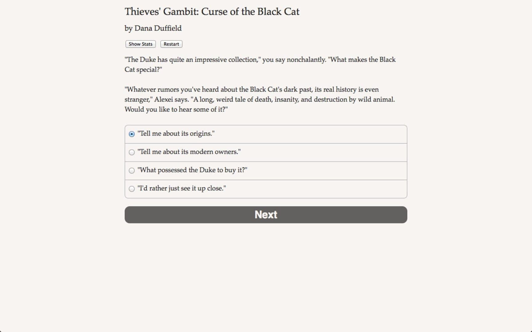 Thieves' Gambit: The Curse of the Black Cat is an interactive heist caper, where your choices control the story. It's entirely text-based without graphics or sound effects and fueled by the vast, unstoppable power of your imagination.