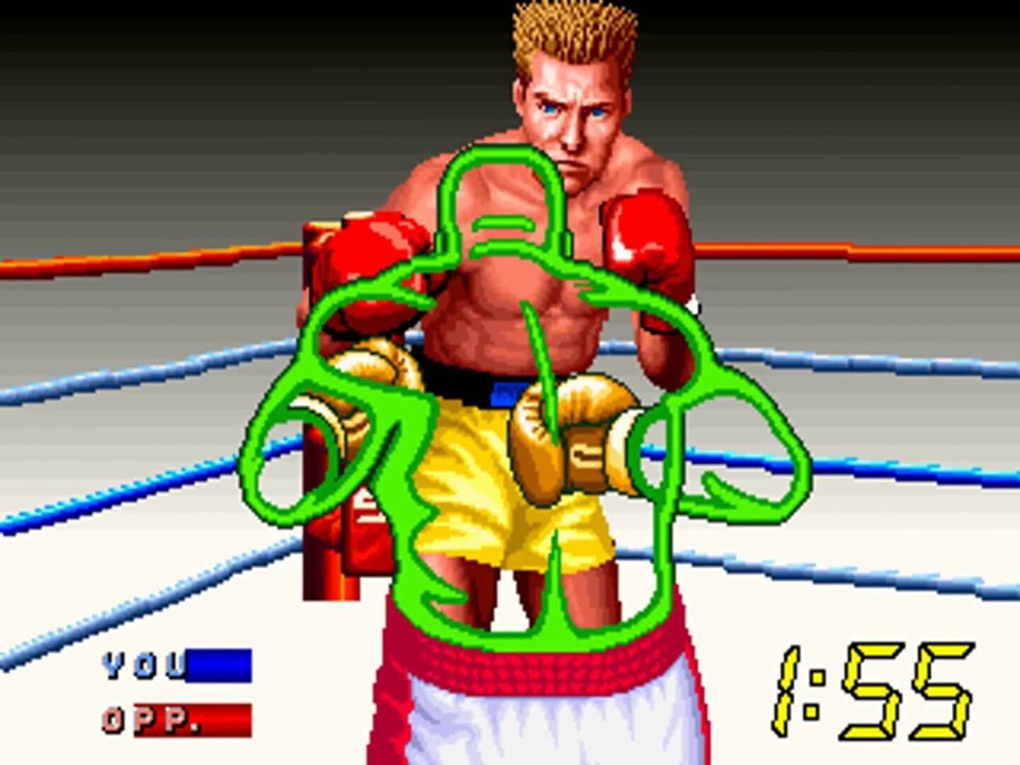 Title Fight is a behind-the-back boxing game developed by Sega-AM3 and released by Sega for arcades (using Sega System 32 hardware) in 1993. A spiritual successor to Sega's 1987 game Heavyweight Champ, Title Fight features a similar twin-joystick control setup that corresponds each oversized joystick (or "glove handle") with each of their boxer's arms, giving the illusion of throwing actual punches and guarding or dodging their opponent. The game follows one of several boxers in their journey to winning the championship belt. Title Fight takes full advantage of the hardware's sprite-scaling effects not only for the large character sprites, but also for the ring itself (which now rotates in a 3D space, allowing for 3D side-stepping). It also features linked multiplayer, one of the few boxing games of its type to do so.