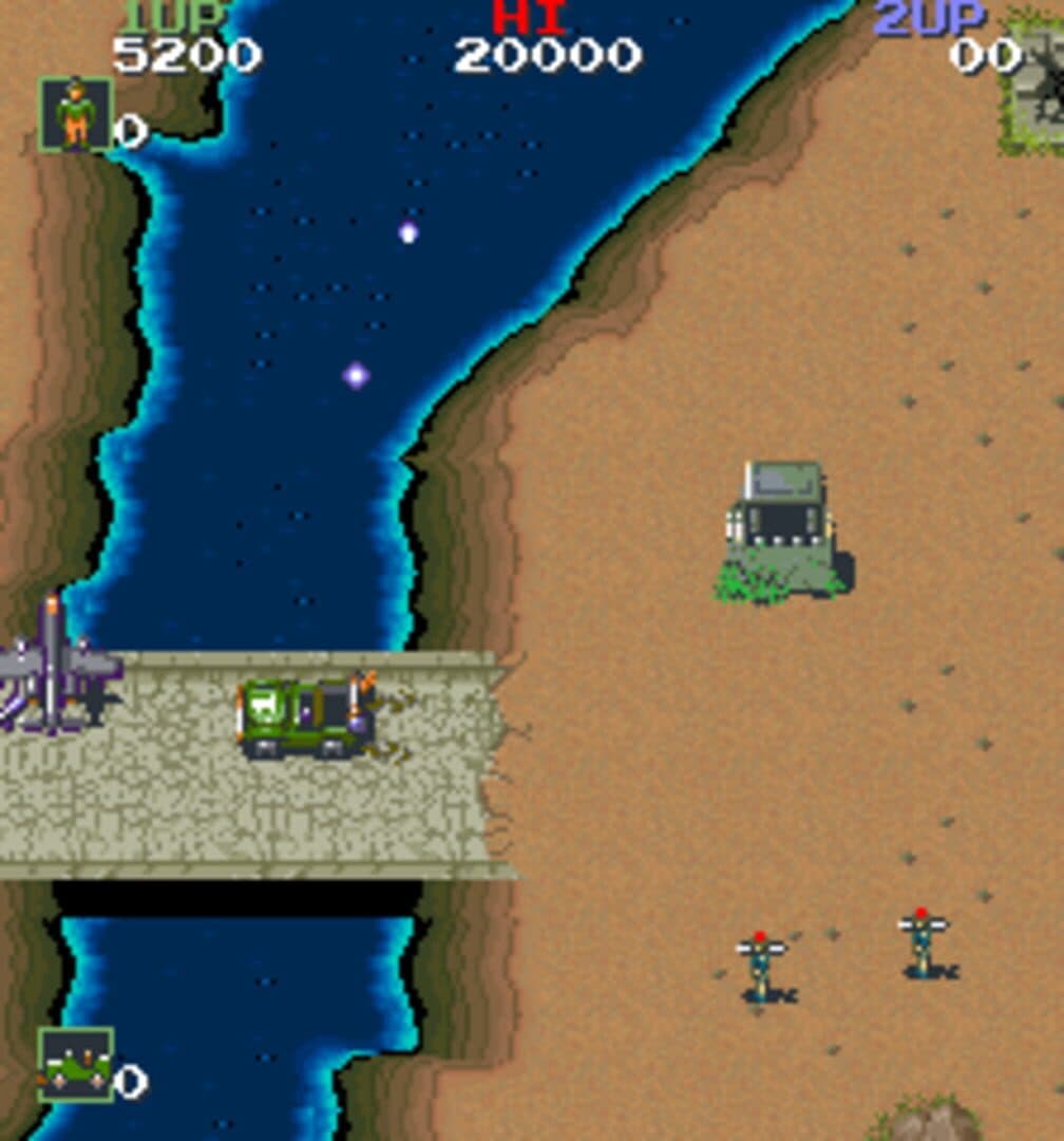 Overhead run'n gun-style shoot-'em-up. You play as jeep driver and gunner rescuing POWs. More commonly known as Jackal outside the US.
